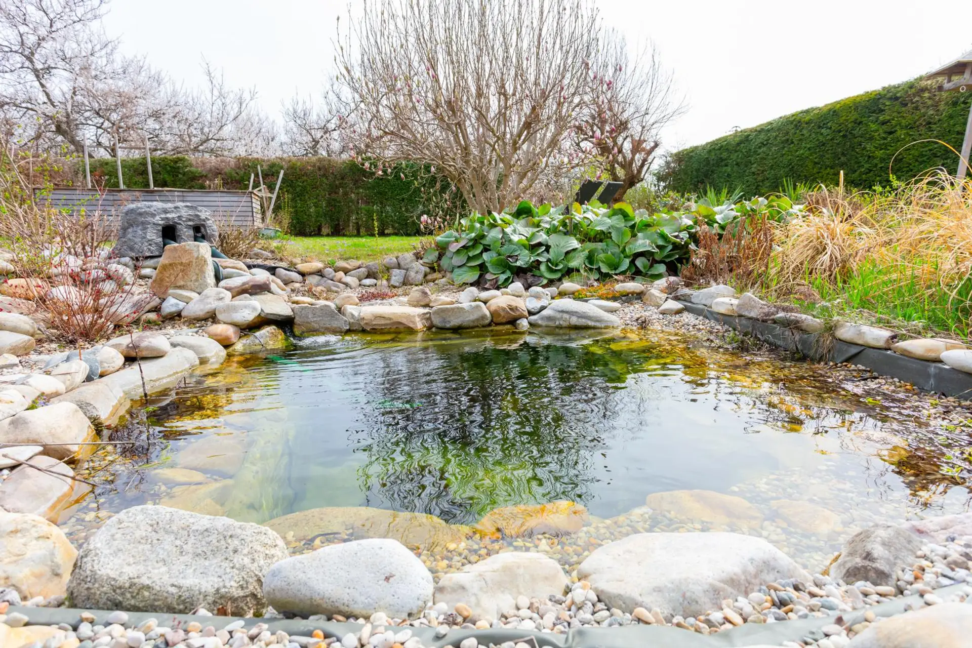Ein weiterer Pluspunkt dieser Immobilie ist neben dem durchdachten Grundriss und der schönen Lage, der liebevoll angelegte Garten mit eigenem kleinem Biotop und Altbaumbestand. Die grüne Einfriedung sorgt für maximale Privatsphäre, die südöstliche Ausrichtung der Terrasse und des Gartens garantiert ungestörte, sonnige Stunden im Freien.