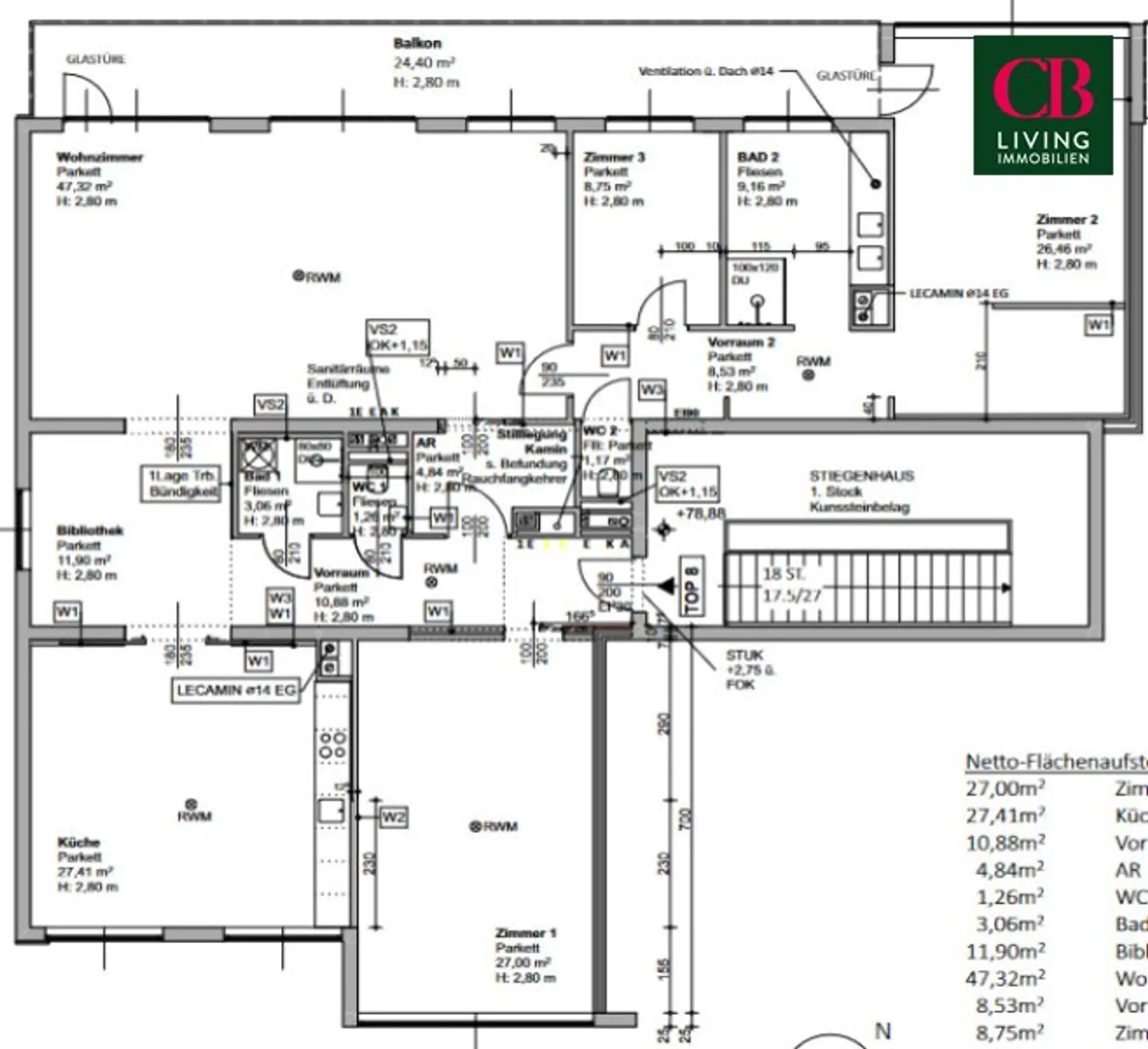 Die 187 m² plus 24 m² Balkon liegen auf einer Ebene. Die Wohnung ist mit einer neuen Fußbodenheizung (Klimaboden) in allen Zimmern ausgestattet, die mit Strom betrieben wird.