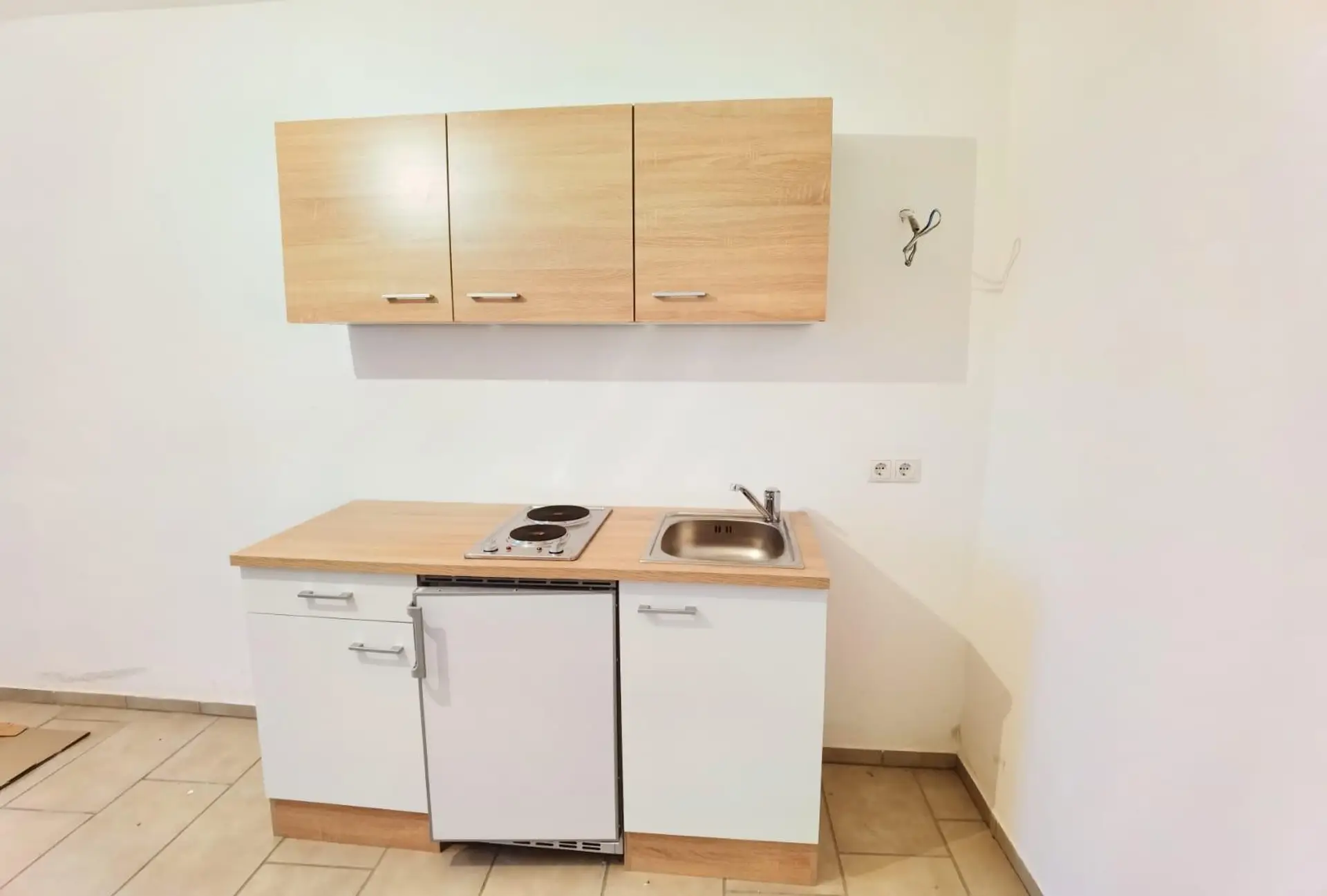 Ein Vorraum, eine möblierte Klein-Küche mit Kochmöglichkeit (2-Platten-Herd, Kühlschrank) und Platz für einen Essbereich, ein Wohn-/Schlafzimmer, ein Badezimmer mit Badewanne sowie ein separates WC stehen zur Verfügung.