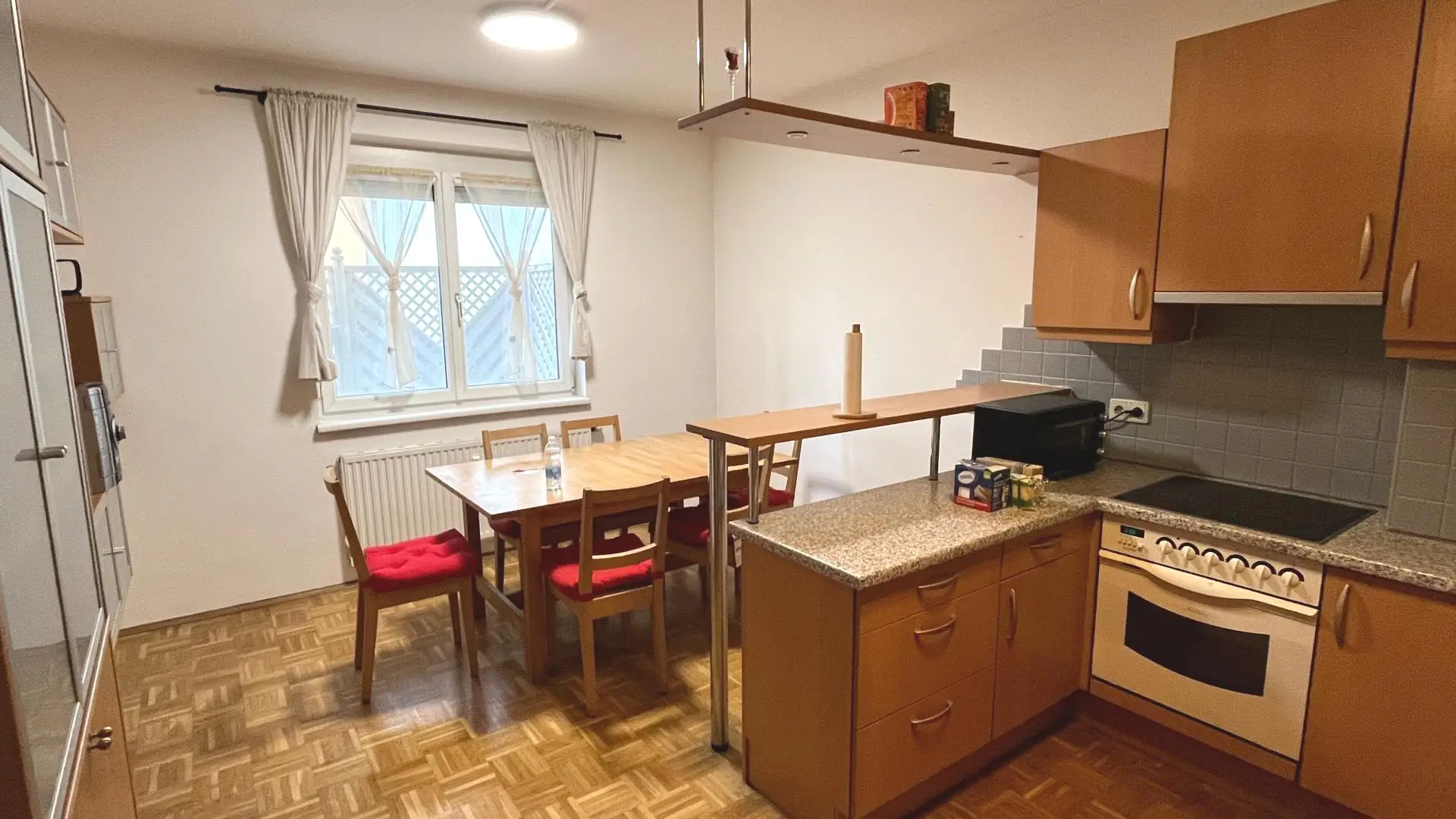 Die Küche ist mit einem praktischen Essplatz ausgestattet und fügt sich harmonisch in das Wohnkonzept ein.