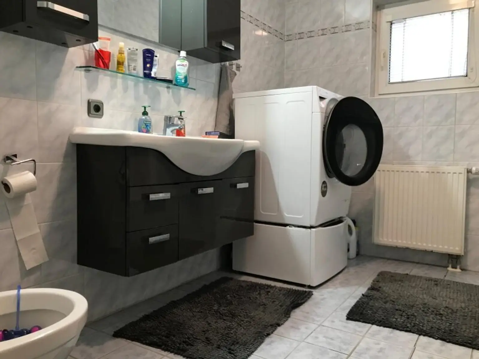 Das Badezimmer präsentiert sich modern und stilvoll gestaltet und verbindet Funktionalität mit zeitloser Eleganz. Ein gut durchdachter Eingangs- und Garderobenbereich rundet das Raumkonzept ab.