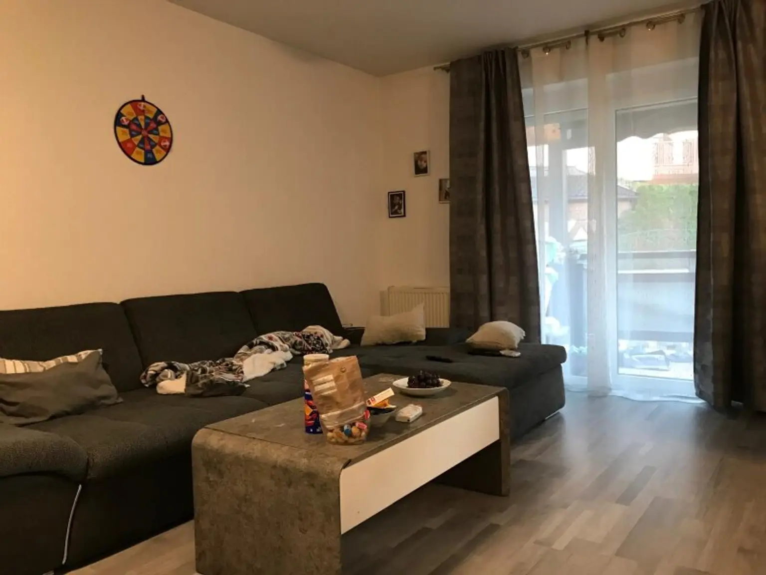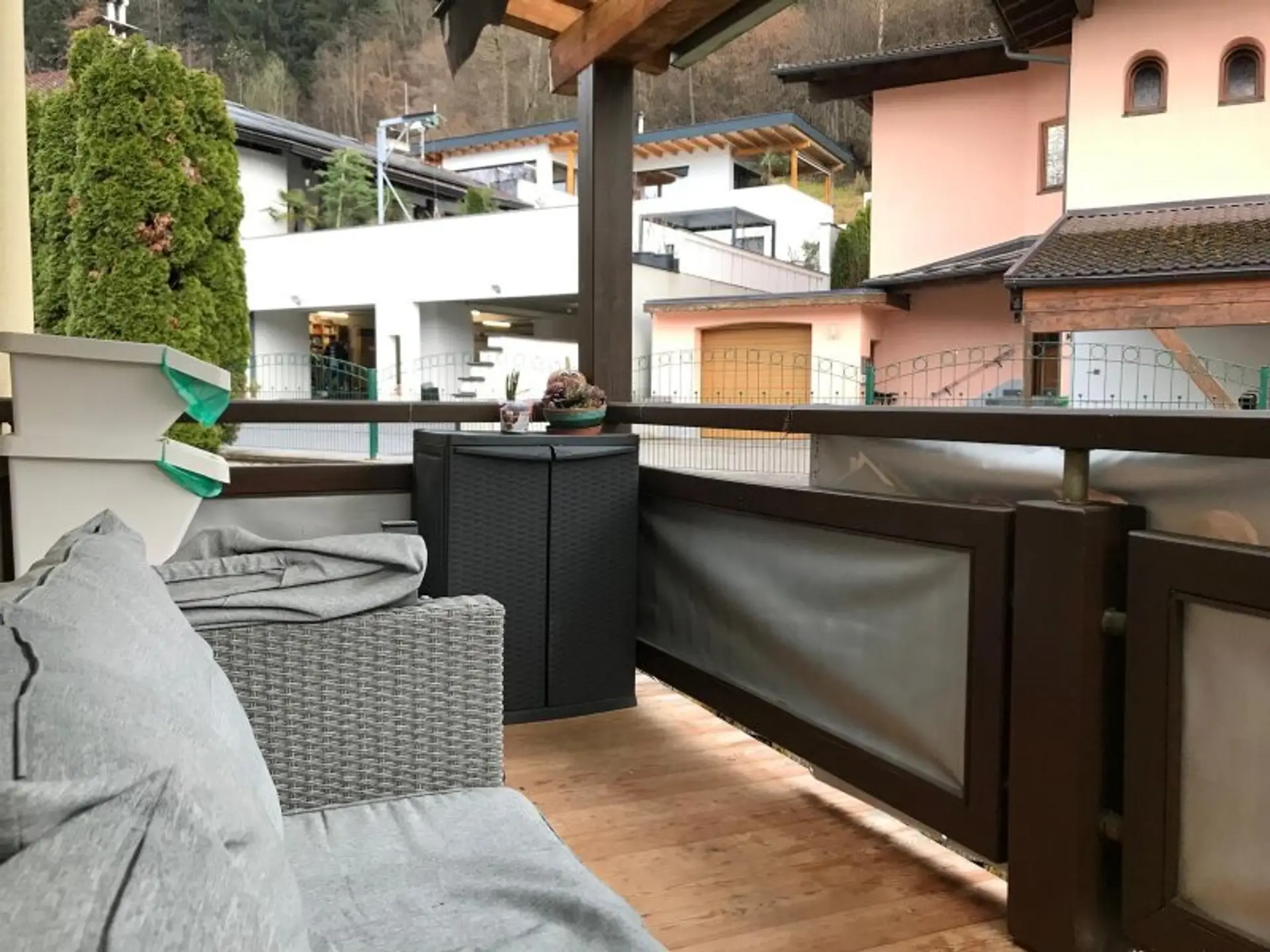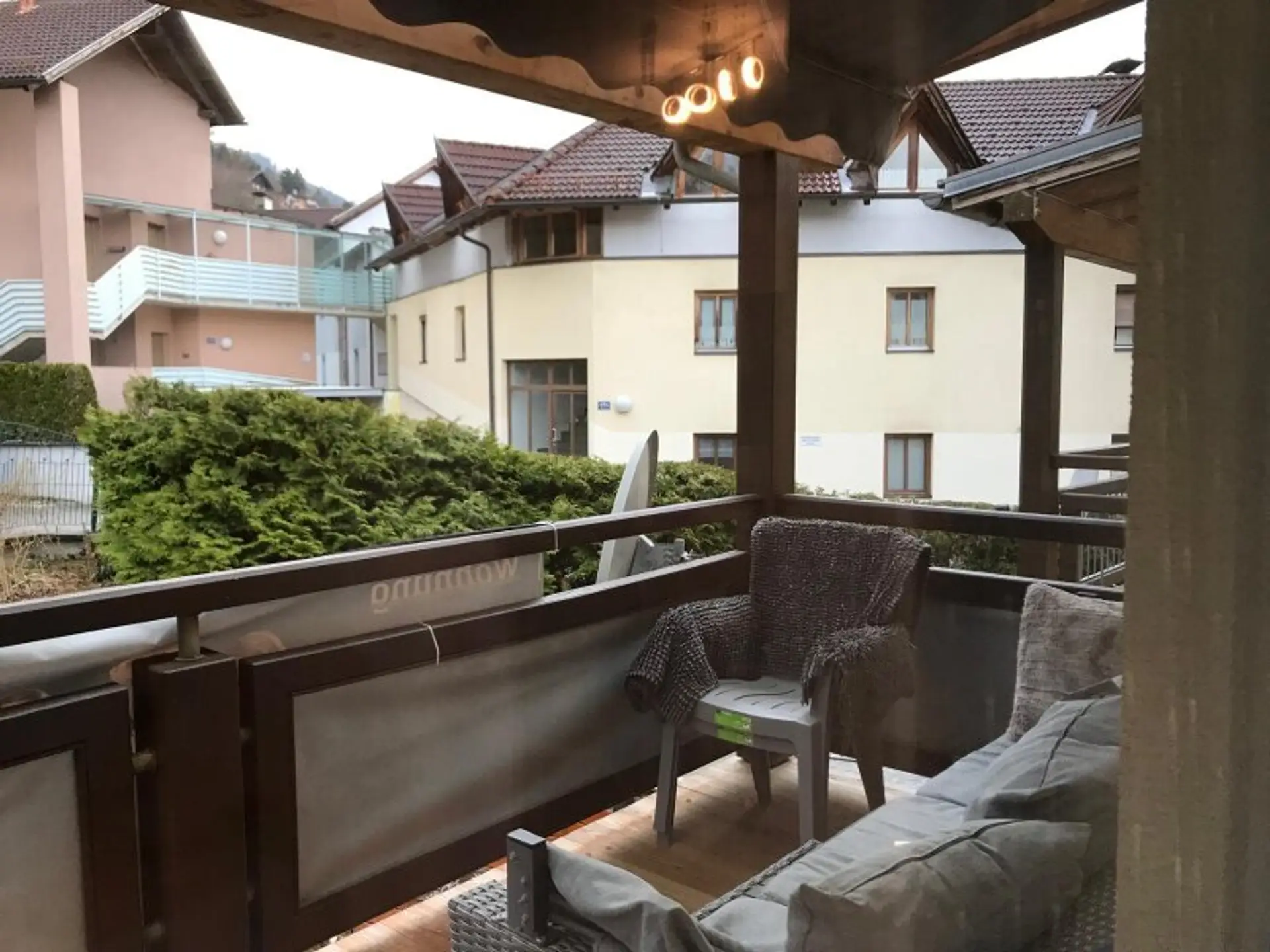 Vom Wohnzimmer aus gelangen Sie direkt auf den großzügigen Balkon. Dank der Glasüberdachung lässt sich dieser nahezu ganzjährig nutzen – ob für entspannte Stunden am Abend oder einen ruhigen Start in den Tag mit Blick ins Grüne.