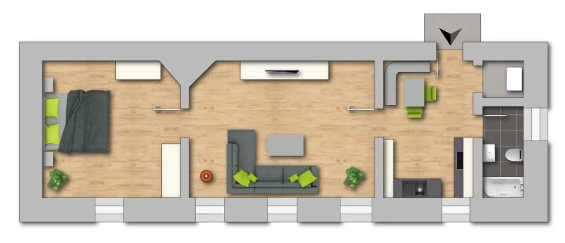 Die Wohnfläche erstreckt sich über ca. 76m² und umfasst eine gemütliche Küche, ein geräumiges Wohnzimmer,