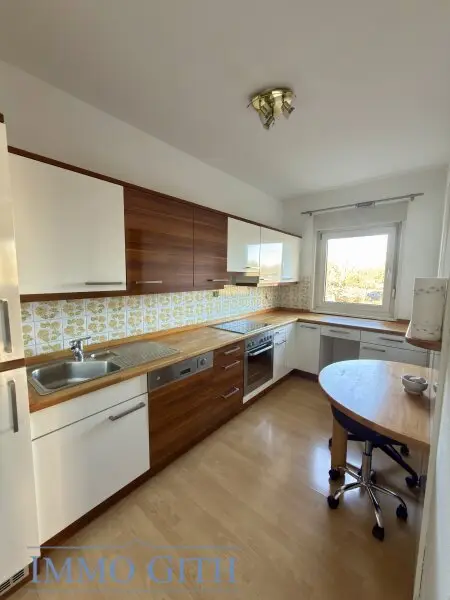 Aus dem Wohnzimmer gelangt man direkt in die großzügige Küche, die viel Arbeitsfläche und Stauraum bietet und funktional ausgestattet ist.
