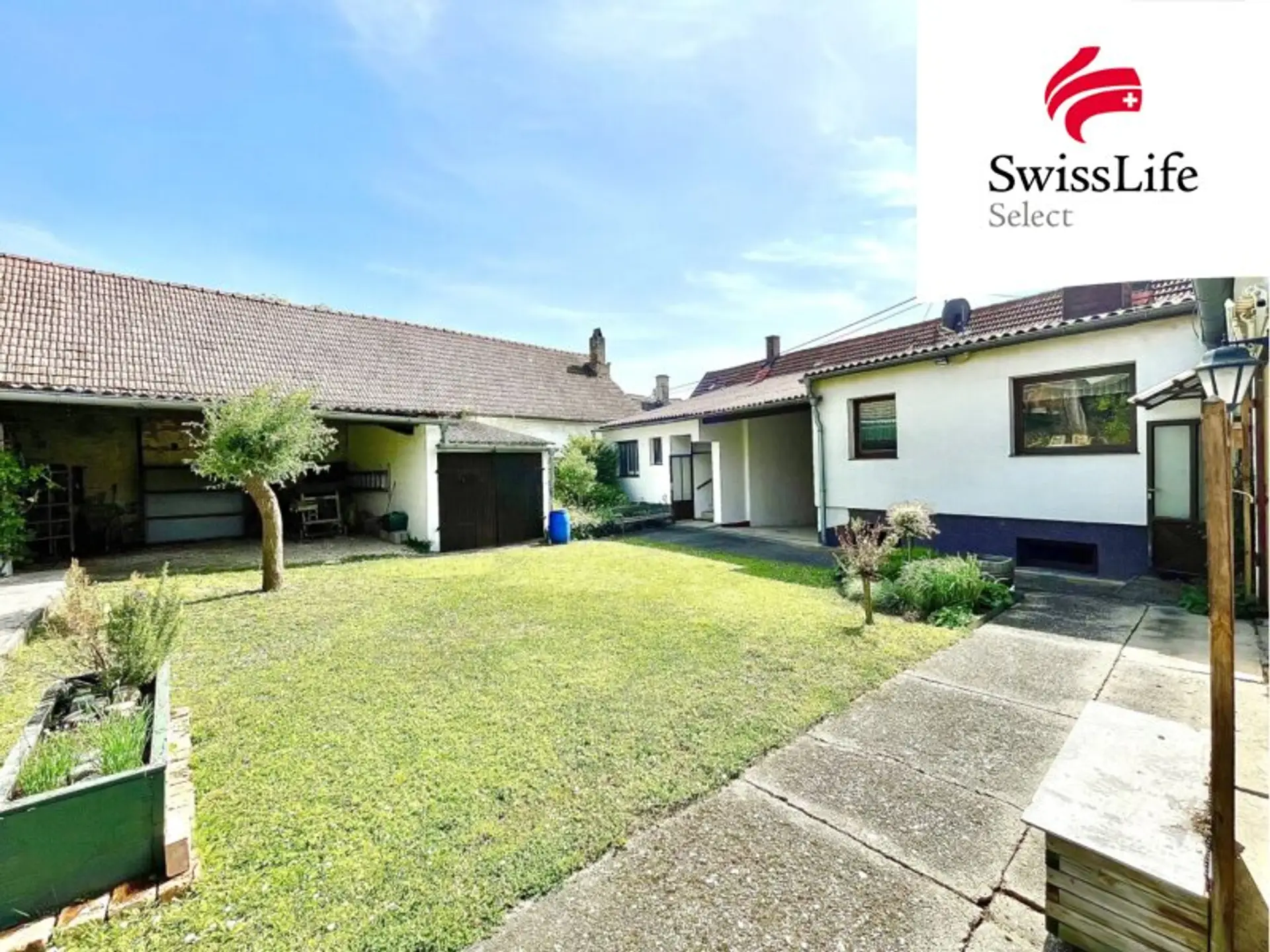 Der großzügige Garten ist mit einer Vielzahl von Obstbäumen, Sträuchern und Blumen umgeben, die eine natürliche Grenze und Privatsphäre bieten.