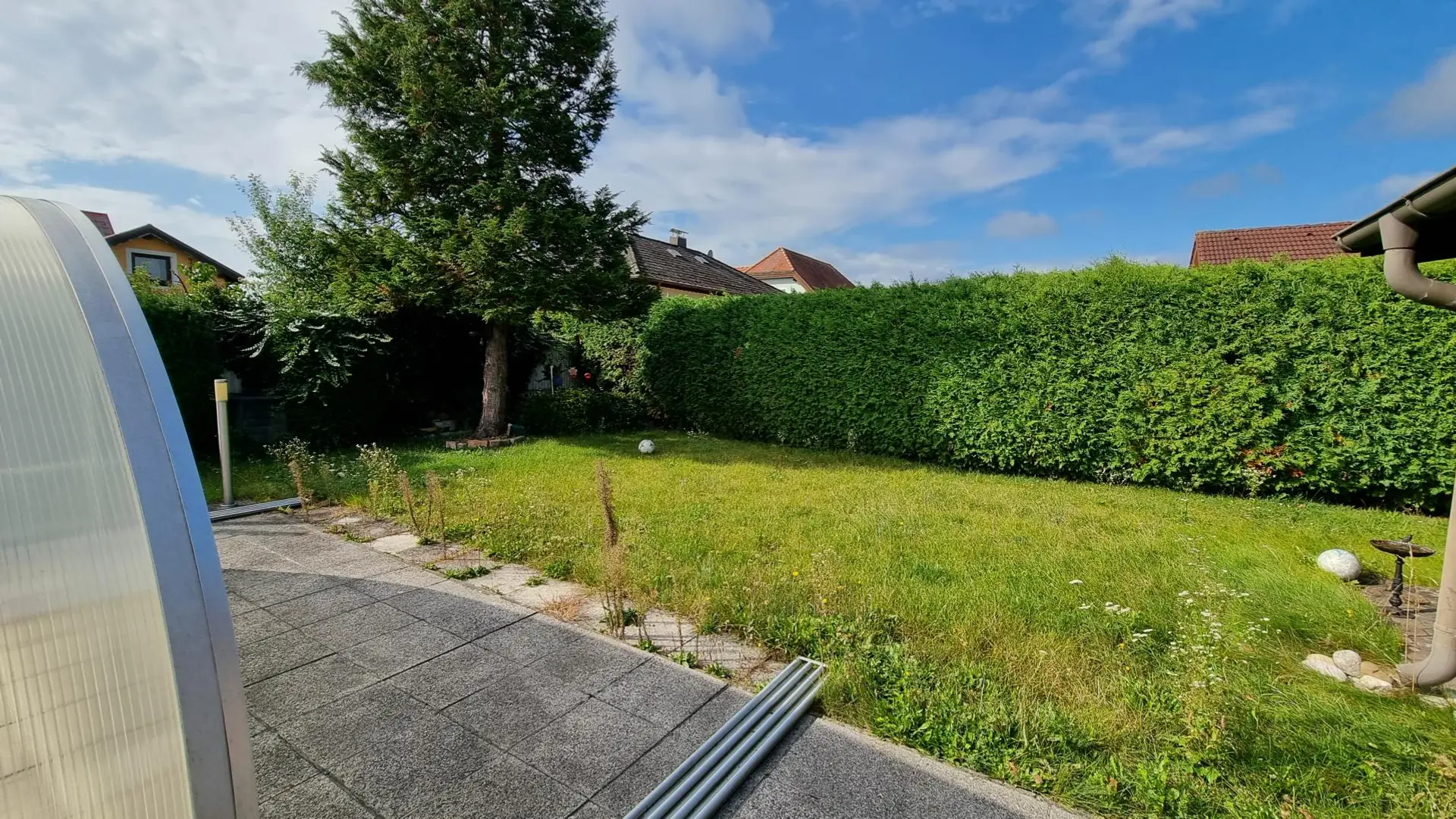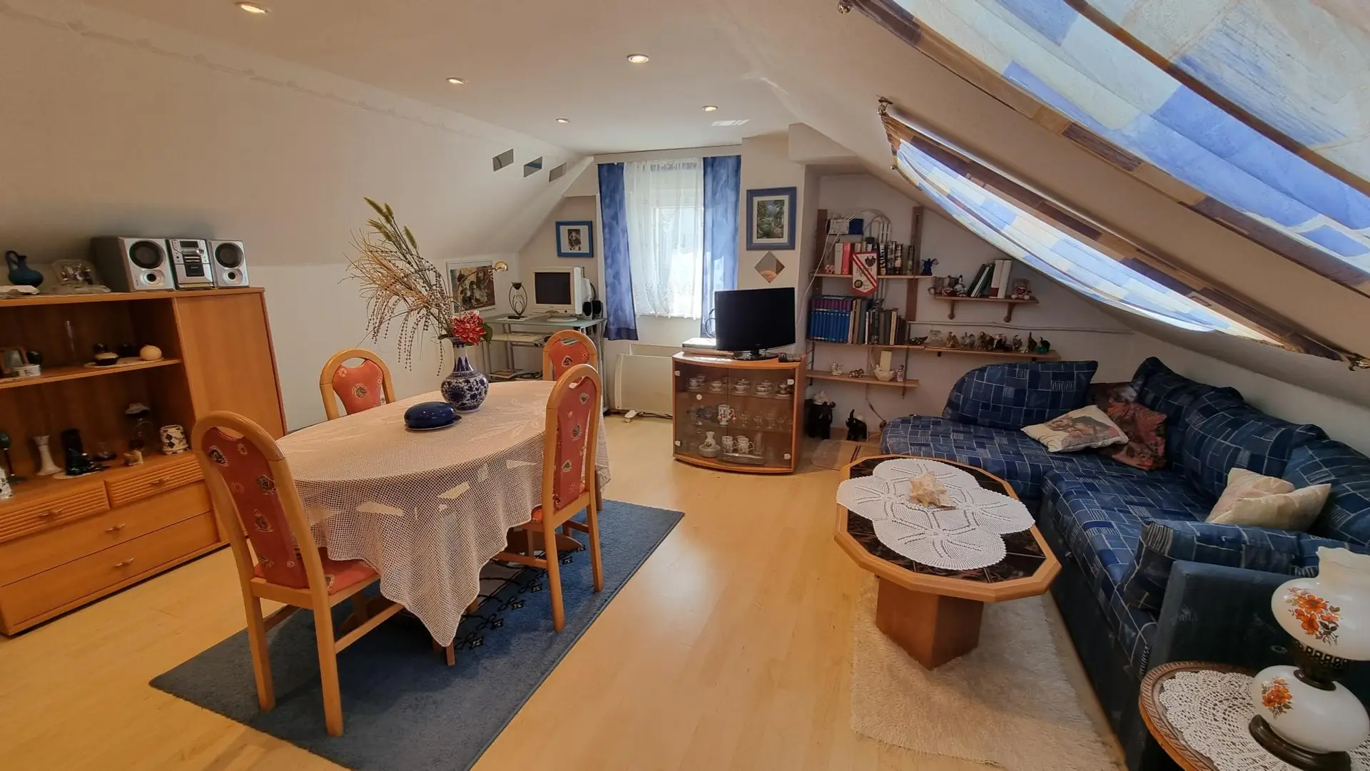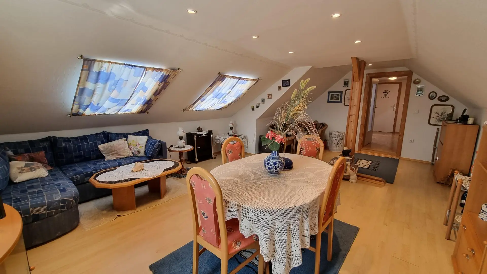 Das Wohnzimmer bietet Zugang zum Schlafzimmer und führt über einige Stufen weiter in den Wintergarten, der durch seine Helligkeit und den Blick in den Garten zum Entspannen einlädt. Im Dachgeschoss befinden sich ein Vorraum und ein größerer, ausgebauter Raum, der sich ideal als Gästezimmer, Büro oder Hobbyraum eignet.