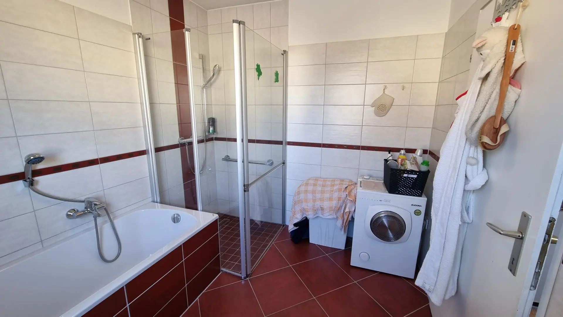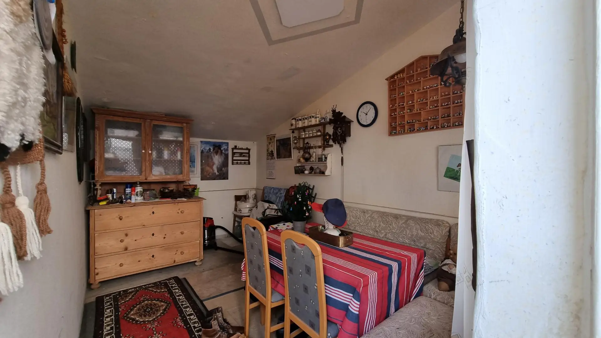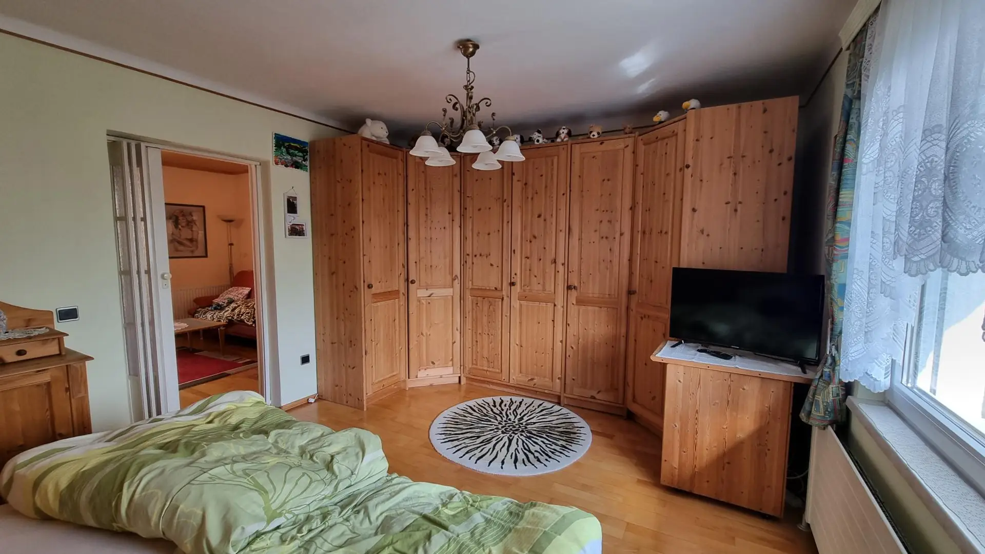 Das Wohnzimmer bietet Zugang zum Schlafzimmer und führt über einige Stufen weiter in den Wintergarten, der durch seine Helligkeit und den Blick in den Garten zum Entspannen einlädt. Im Dachgeschoss befinden sich ein Vorraum und ein größerer, ausgebauter Raum, der sich ideal als Gästezimmer, Büro oder Hobbyraum eignet.