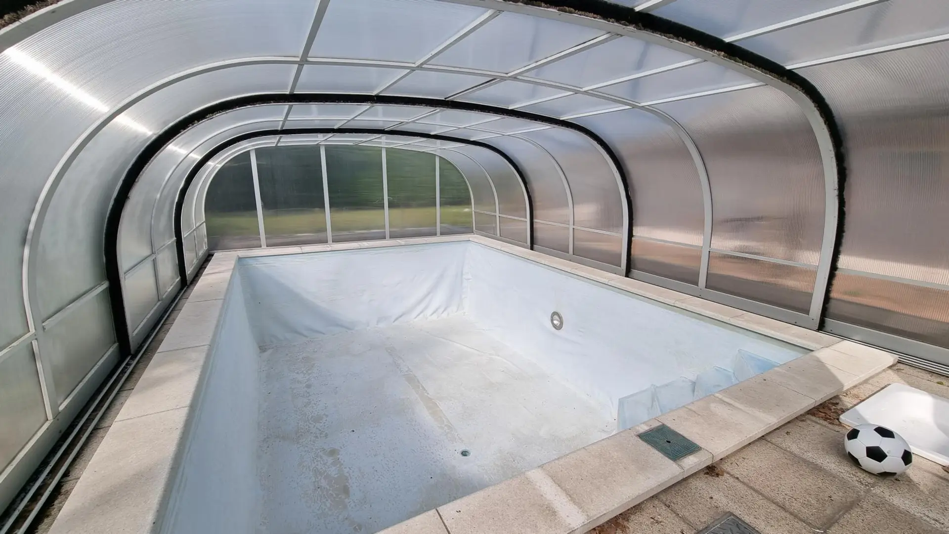 Über die lange Zufahrt gelangt man zum Nebengebäude, das eine Garage, einen Abstellraum und ein gemütliches Stüberl beherbergt. Hinter diesem Nebengebäude befindet sich ein überdachter Pool, der in den Sommermonaten für Erholung und Abkühlung sorgt. Das großzügige Grundstück bietet darüber hinaus ausreichend Platz für Gartenliebhaber, Freizeitaktivitäten oder gemütliche Stunden im Freien.