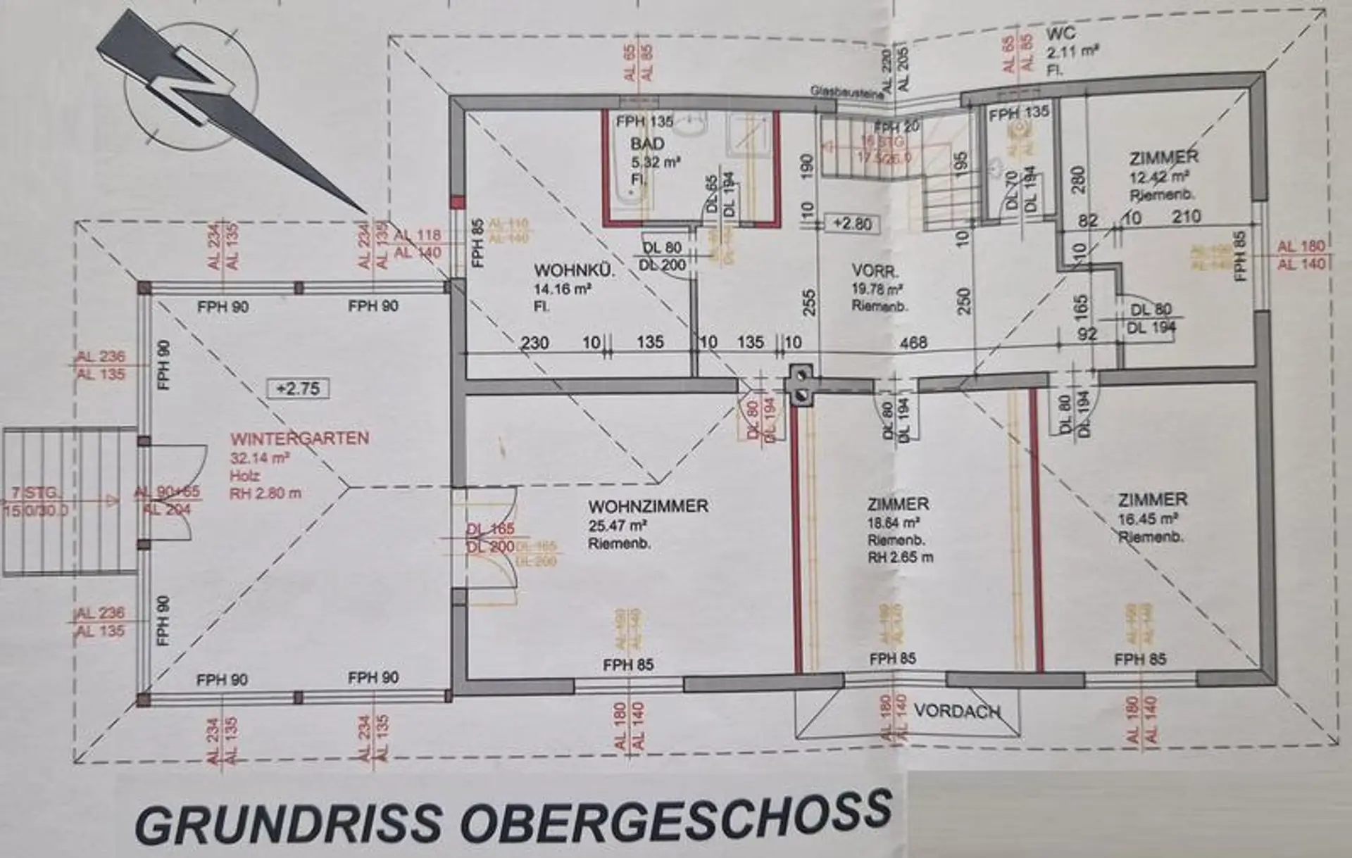 Obergeschoss: Vorraum, Wohnküche, 4 Zimmer, Bad mit Wanne und Dusche, separates WC, sonniger Wintergarten mit ca. 32 m²