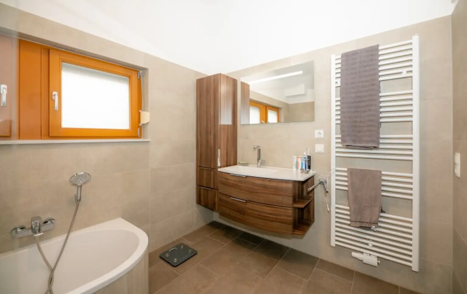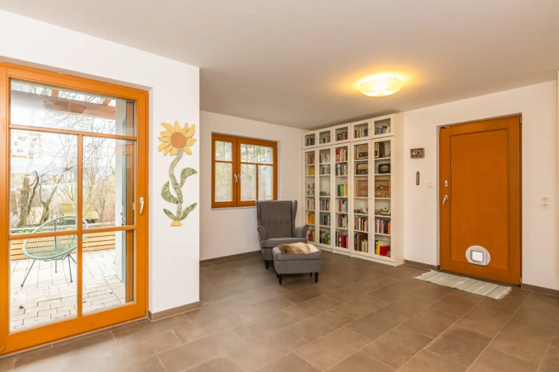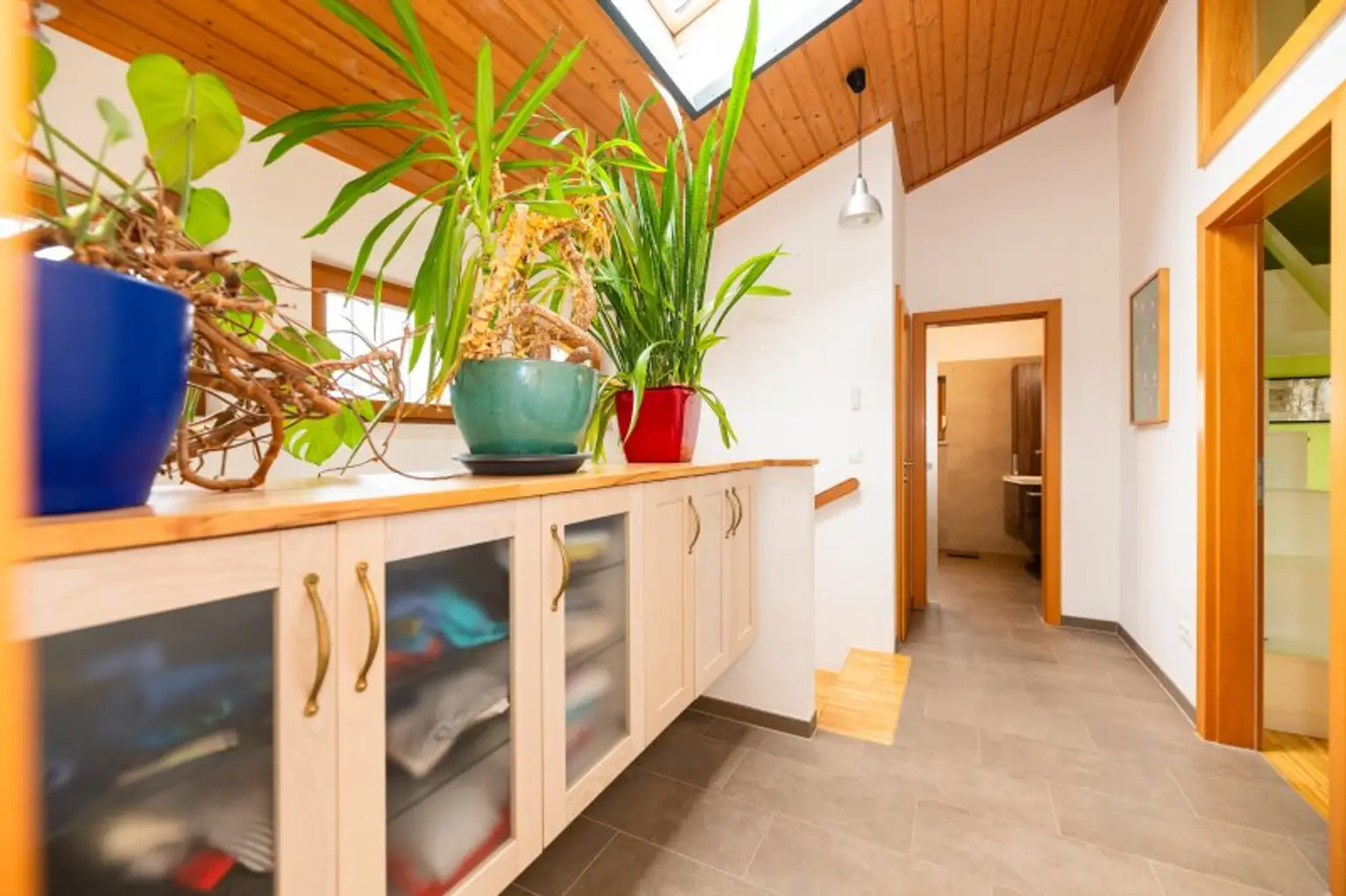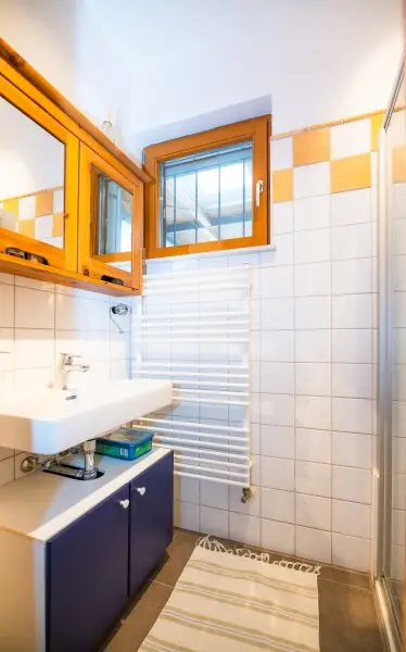 Die Innenräume wurden teilweise 2020 noch moderner ausgestattet und mit neuen Bodenbelägen versehen. Auch die Badezimmer wurden kürzlich erst renoviert (2021) und entsprechen modernen Anforderungen. Die Küche ist mit Miele-Geräten ausgestattet und wurde zum Wohnzimmer geöffnet. Eine Fußbodenheizung in den Nassräumen ergänzt die Radiatoren in den Wohnräumen. Eine Photovoltaikanlage am Dach (6,7kW) wurde 2023 installiert erzeugt in den Sommermonaten Strom im Überfluss und schützt Sie auch im Winter vor hohen Stromkosten. Eine Batterie mit 13 kW speichert die Energie, sodass Sie den Verbrauch tagsüber nach Ihren Bedürfnissen verteilen können.