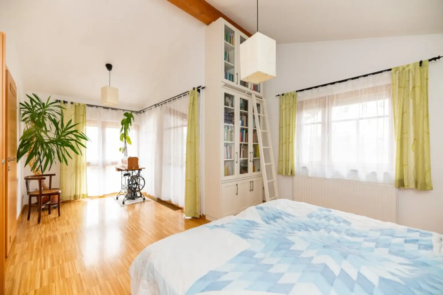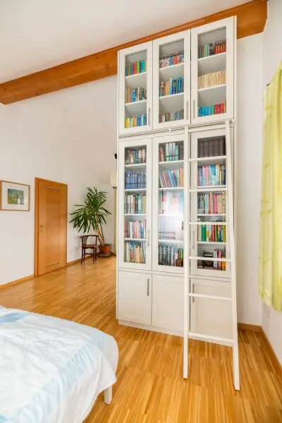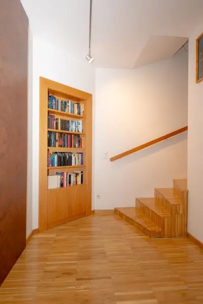 Im oberen Geschoss sind zwei Räume (je ca. 21 m²), ein Schrankraum und ein weiteres Badezimmer sowie eine Toilette untergebracht. Beide Ebenen haben einen Balkon nach Südwesten Richtung Garten. Den durchdacht gestalteten Garten betreten Sie über ein weiteres Wohnzimmer in der unteren Ebene.