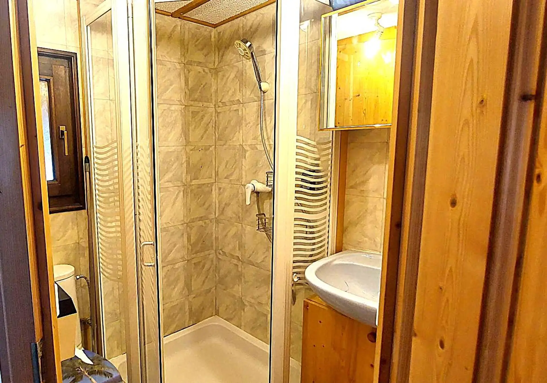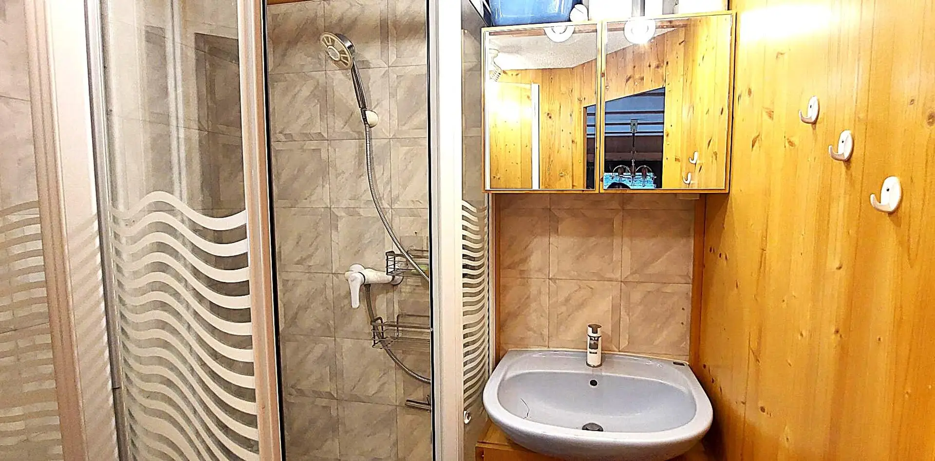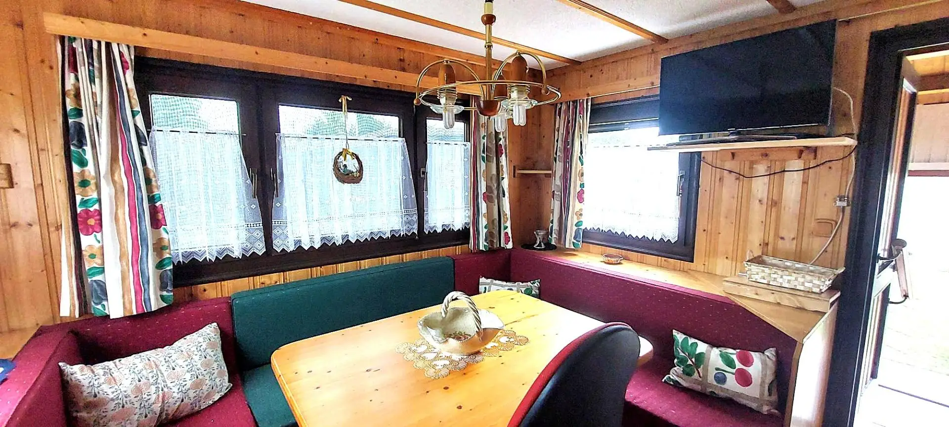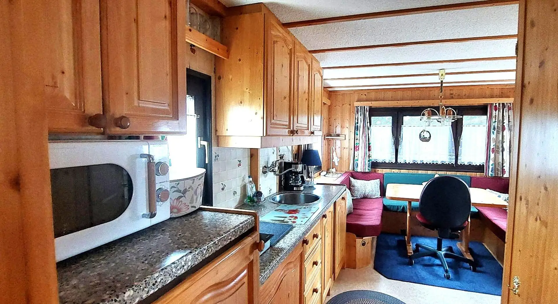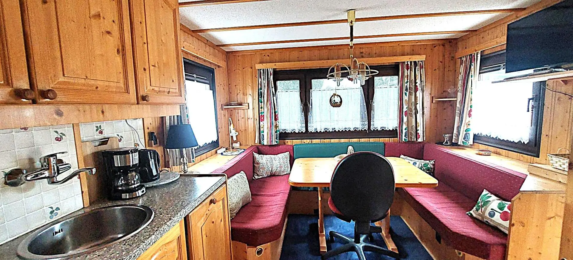 Das Wohnmobil mit einer Wohnfläche von ca. 34m² verfügt über ein Wohn-Esszimmer mit einer Küchenzeile, einem Schlafzimmer, einem Badezimmer mit Dusche und WC . Eine ca.9 m² große überdachte Terrasse mit Plissée-Verbau sorgt für einen angenehmen Aufenthalt . Im Garten gibt es eine Gartenküche mit Strom – und Wasseranschluss, einen Gartenbrunnen, eine Solardusche mit 60 Liter Wasserspeicher ,eine Werkstatt und einen kleinen Geräteschuppen. Das Mobilheim steht auf einer Parzelle mit ca 185 m².