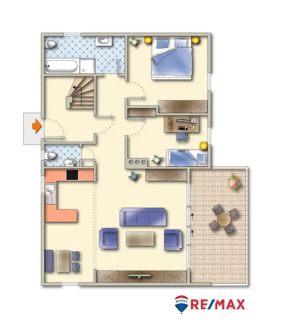Vorraum, Bad, WC, große Wohnküche mit Essplatz und mit anschließender Terrasse, Schlafzimmer, Zimmer