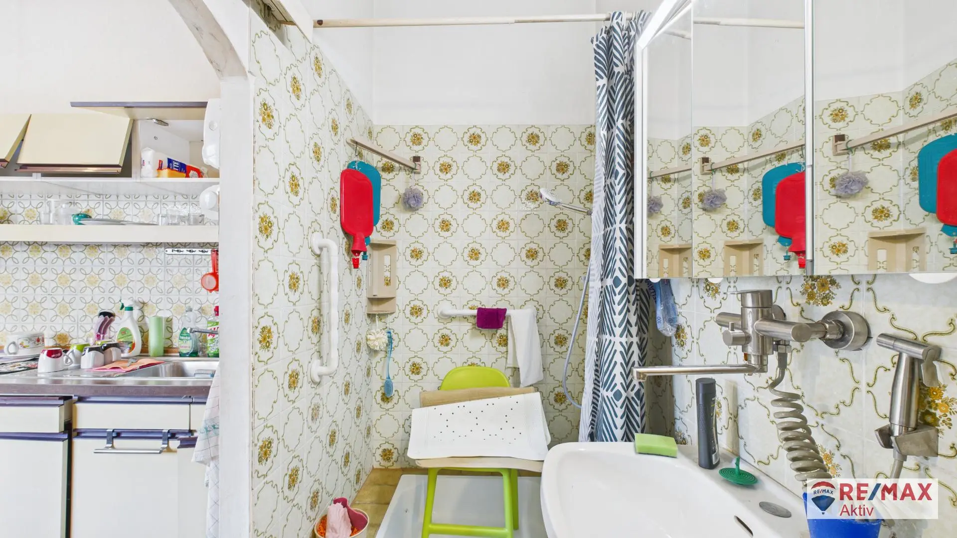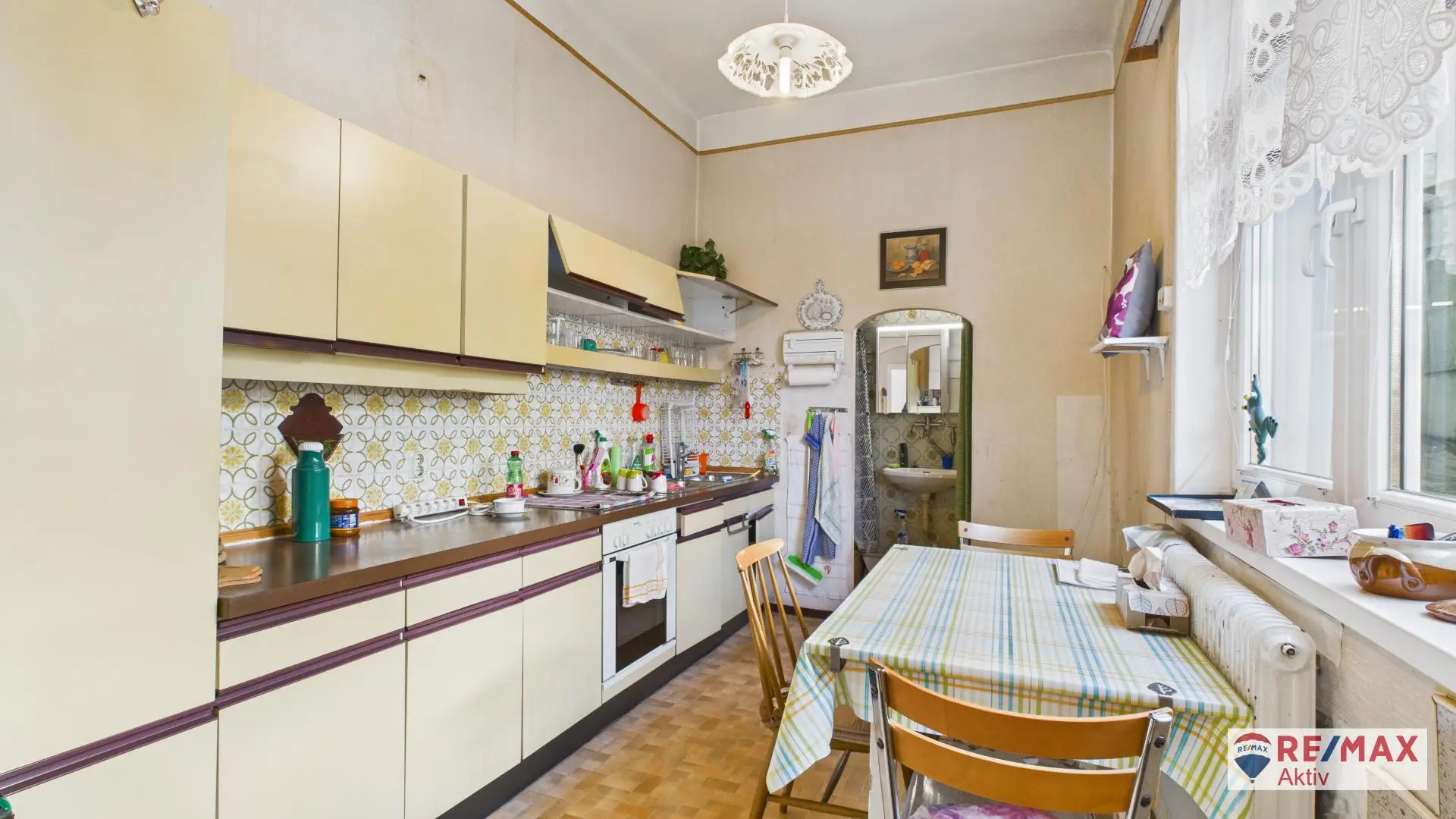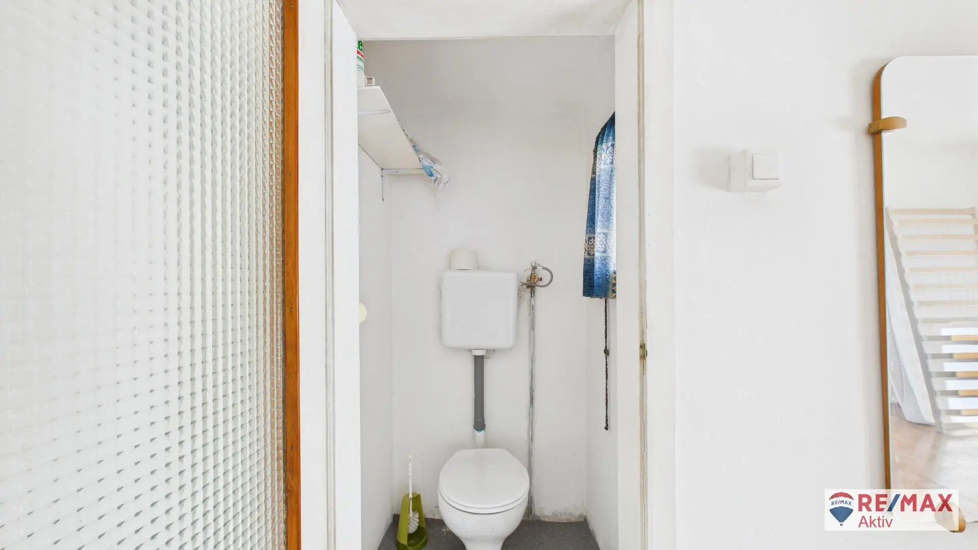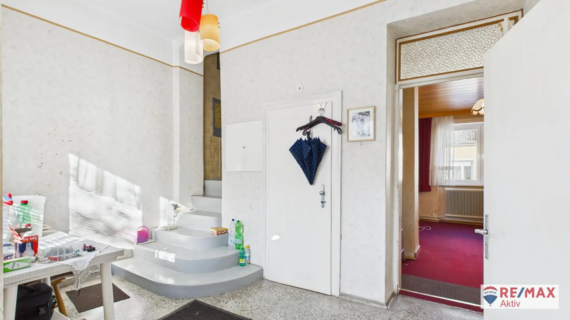 Vom Eingangsbereich gelangt man direkt in die Küche, die das Zentrum des Erdgeschosses bildet. Dahinter befindet sich ein kleines Badezimmer mit Dusche und Waschbecken sowie ein separates WC. Vom Vorzimmer aus sind außerdem drei Zimmer zentral begehbar – ideal als Schlafzimmer, Kinder- oder Wohnzimmer. Die flexible Raumaufteilung macht das Erdgeschoss vielseitig nutzbar und bietet Platz für unterschiedliche Wohnkonzepte.