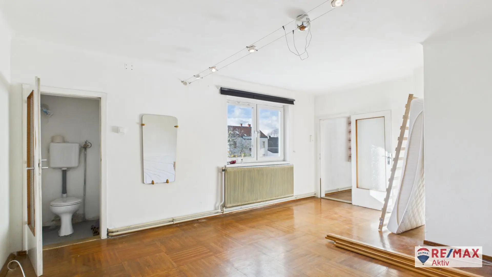 Über die Treppe im Vorzimmer gelangt man ins teilweise ausgebaute Dachgeschoss. Ein Zimmer, in dem sich bereits ein Waschbecken befindet, eignet sich hervorragend dafür, zu einer kleinen Küche umgebaut zu werden – ideal für eine eigenständige Wohneinheit oder als Studio-Bereich. Dahinter liegt ein großzügiges Schlafzimmer mit eigener Toilette.