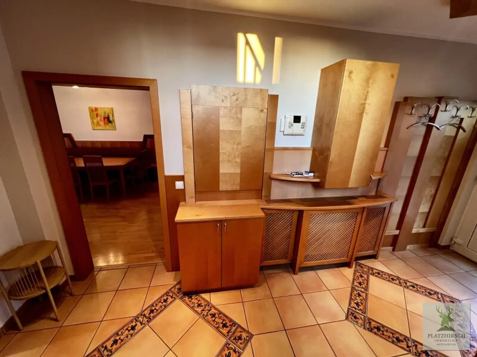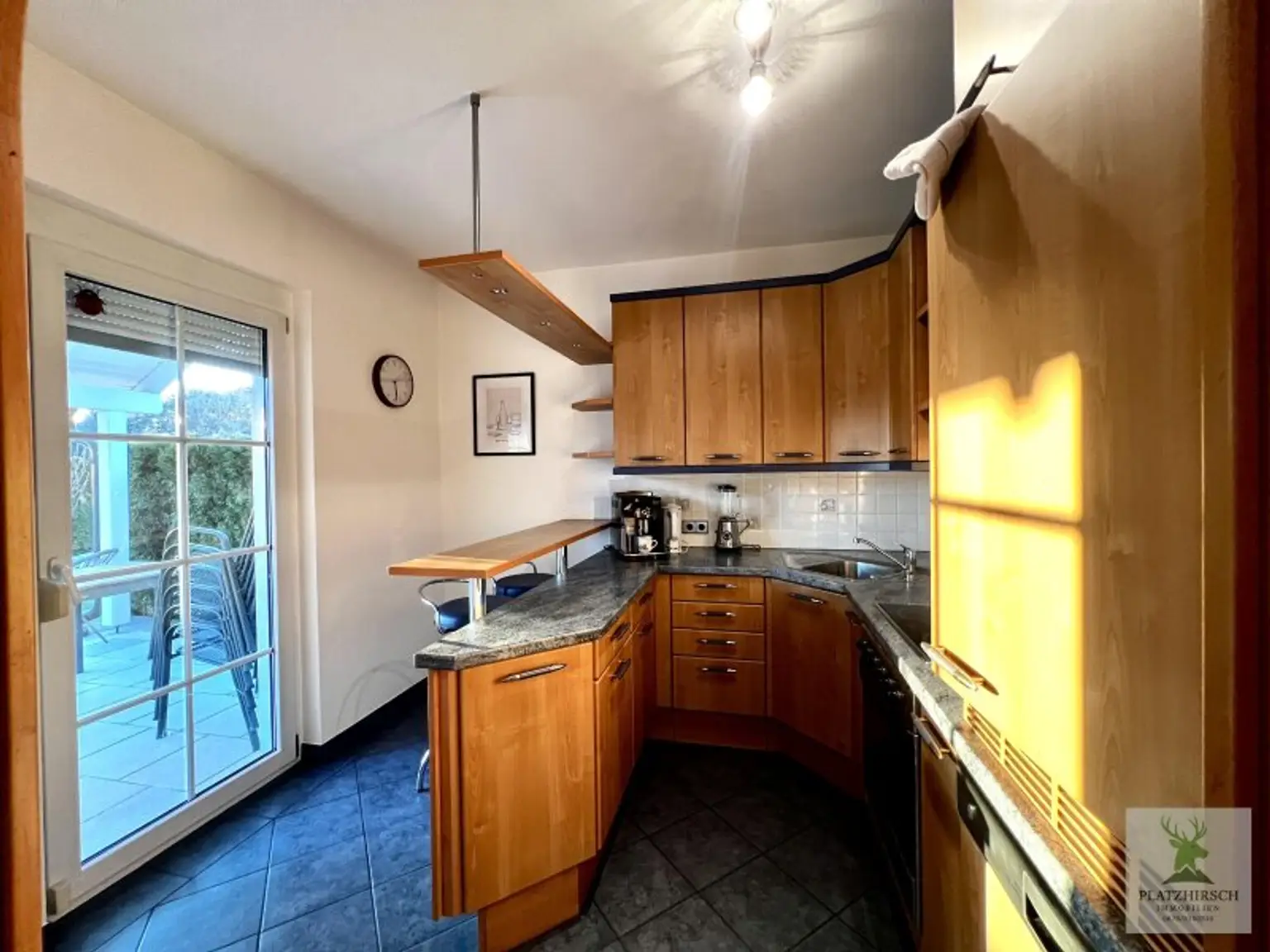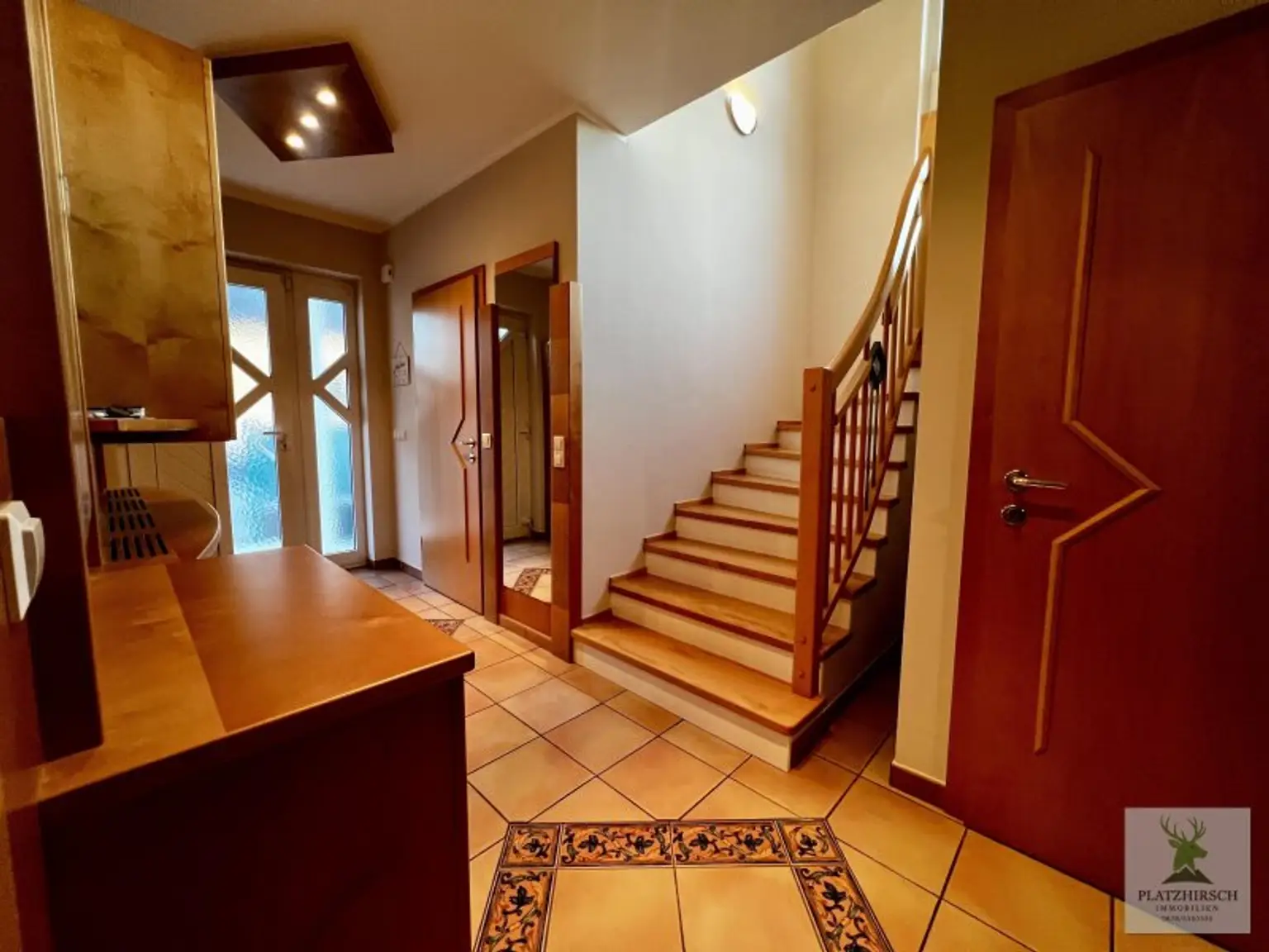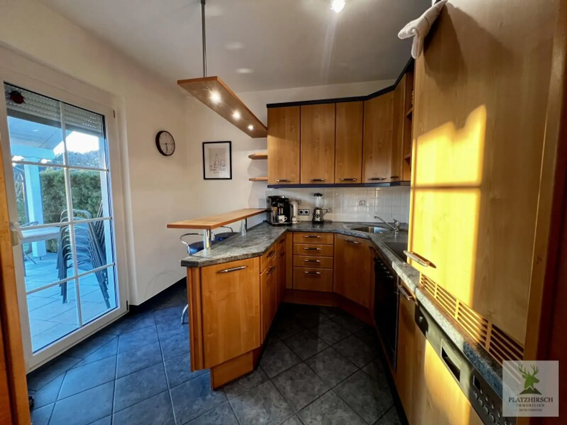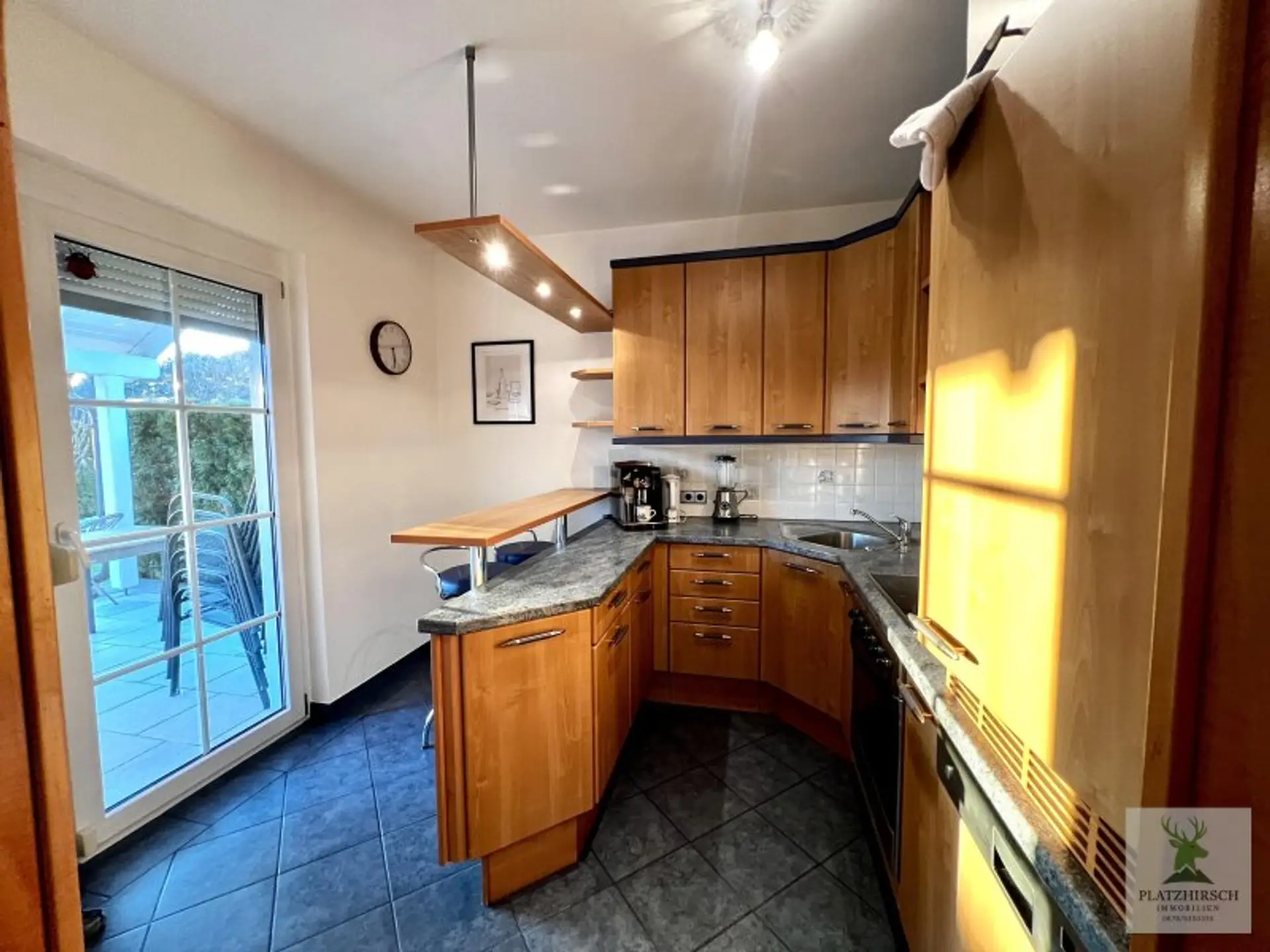 Erdgeschoss: ein einladender, gefliester Eingangsbereich mit separatem Gäste-WC, eine moderne Küche mit Sitzbar und Ausgang zur Terrasse, ein kleiner Abstellraum sowie ein großzügiger, geschmackvoll eingerichteter Wohn- und Essbereich mit Blick in den Garten.