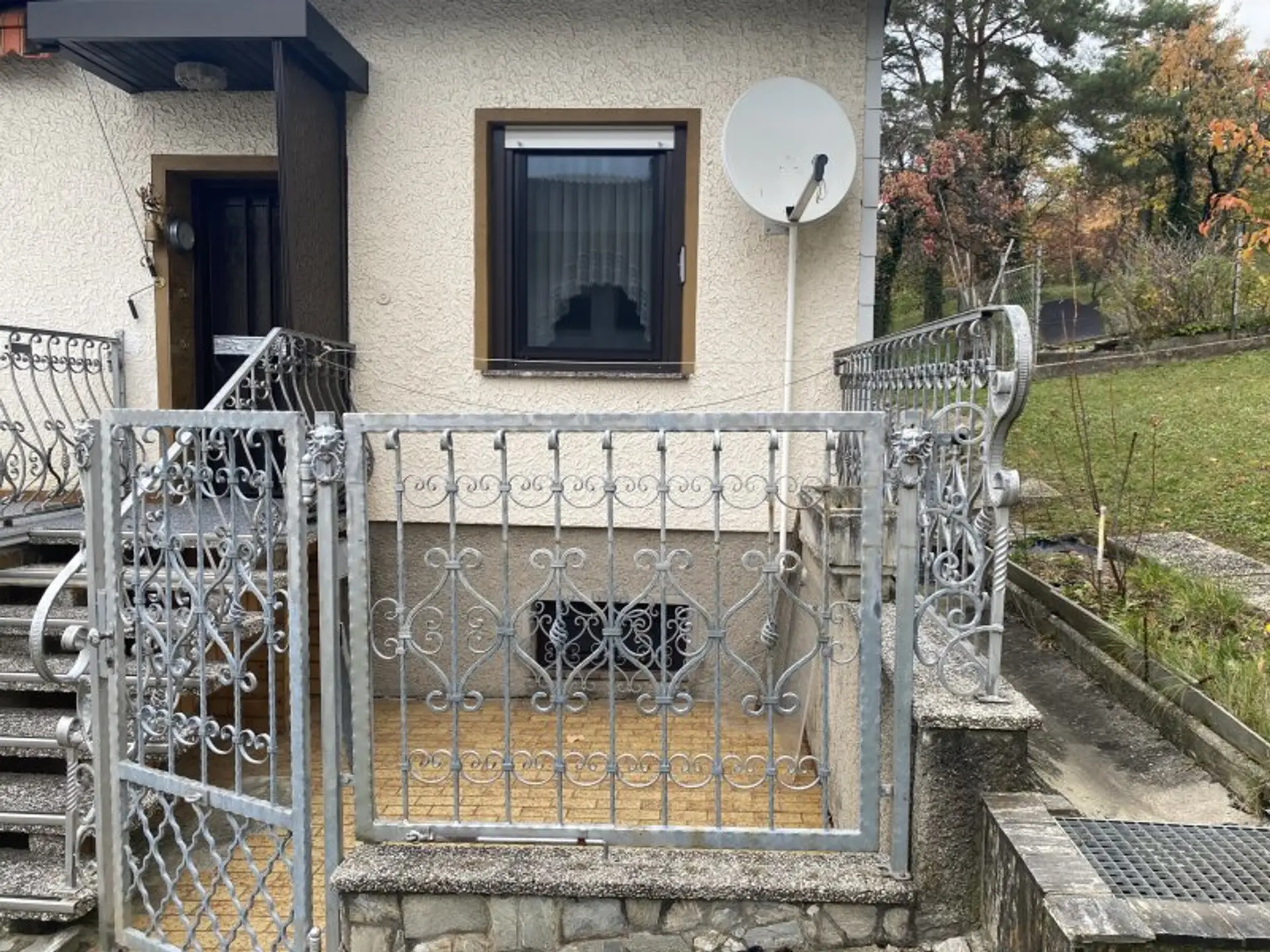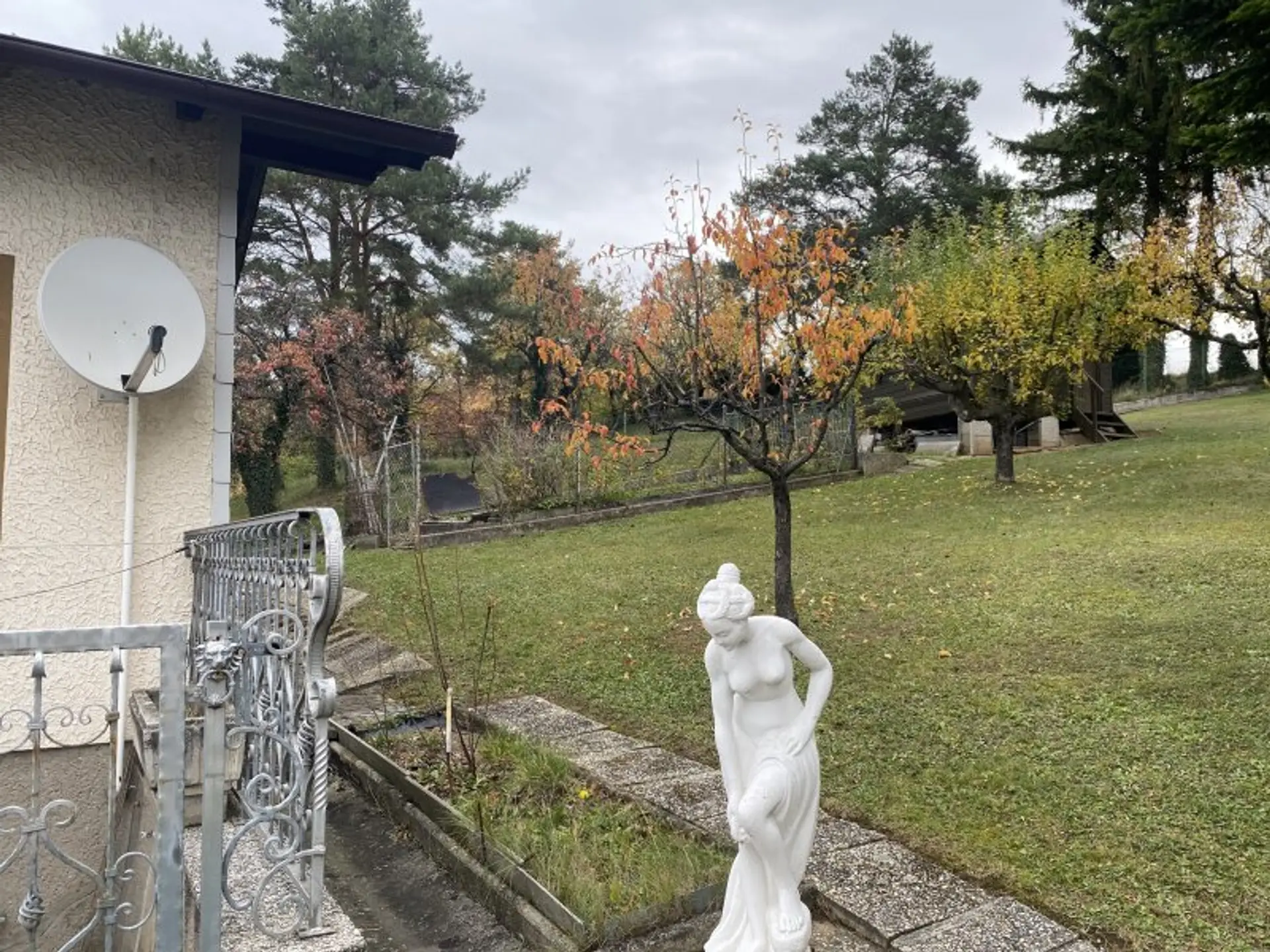 Schöne schmiedeeiserne Zäune und einige schöne Figuren bezaubern den netten Vorgarten.