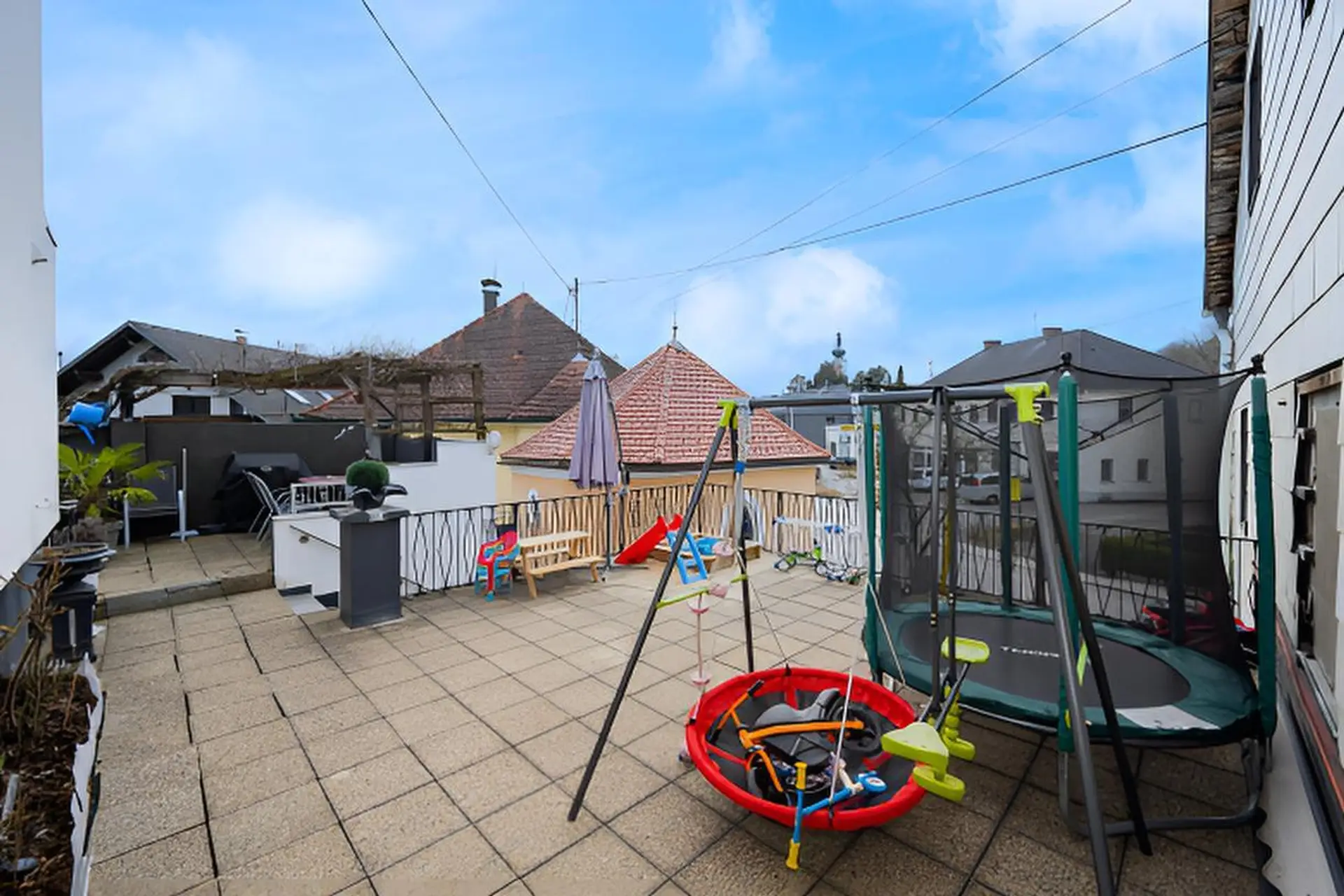 Die sonnige, großzügige Terrasse erweitert den Wohnraum nach draußen und schafft einen echten Wohlfühlbereich im Freien. Ob zum Entspannen, als Spielbereich für Kinder, für gesellige Grillabende oder für Hochbeete mit Kräutern, Gemüse und Blumen – hier lässt sich das Leben im Freien vielseitig genießen. Ein Platz zum Durchatmen, Abschalten und Auftanken. Zudem bietet der Balkon im Obergeschoss einen weiteren gemütlichen Platz im Freien.