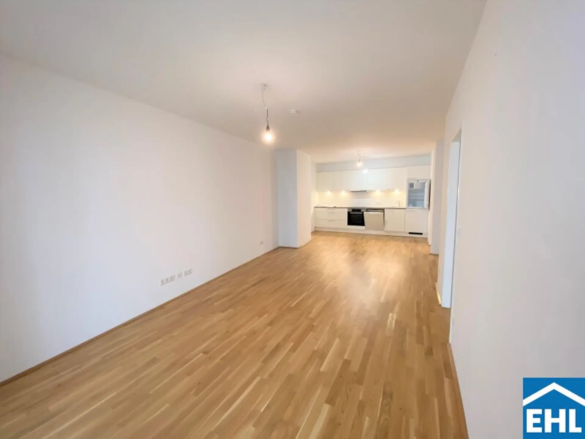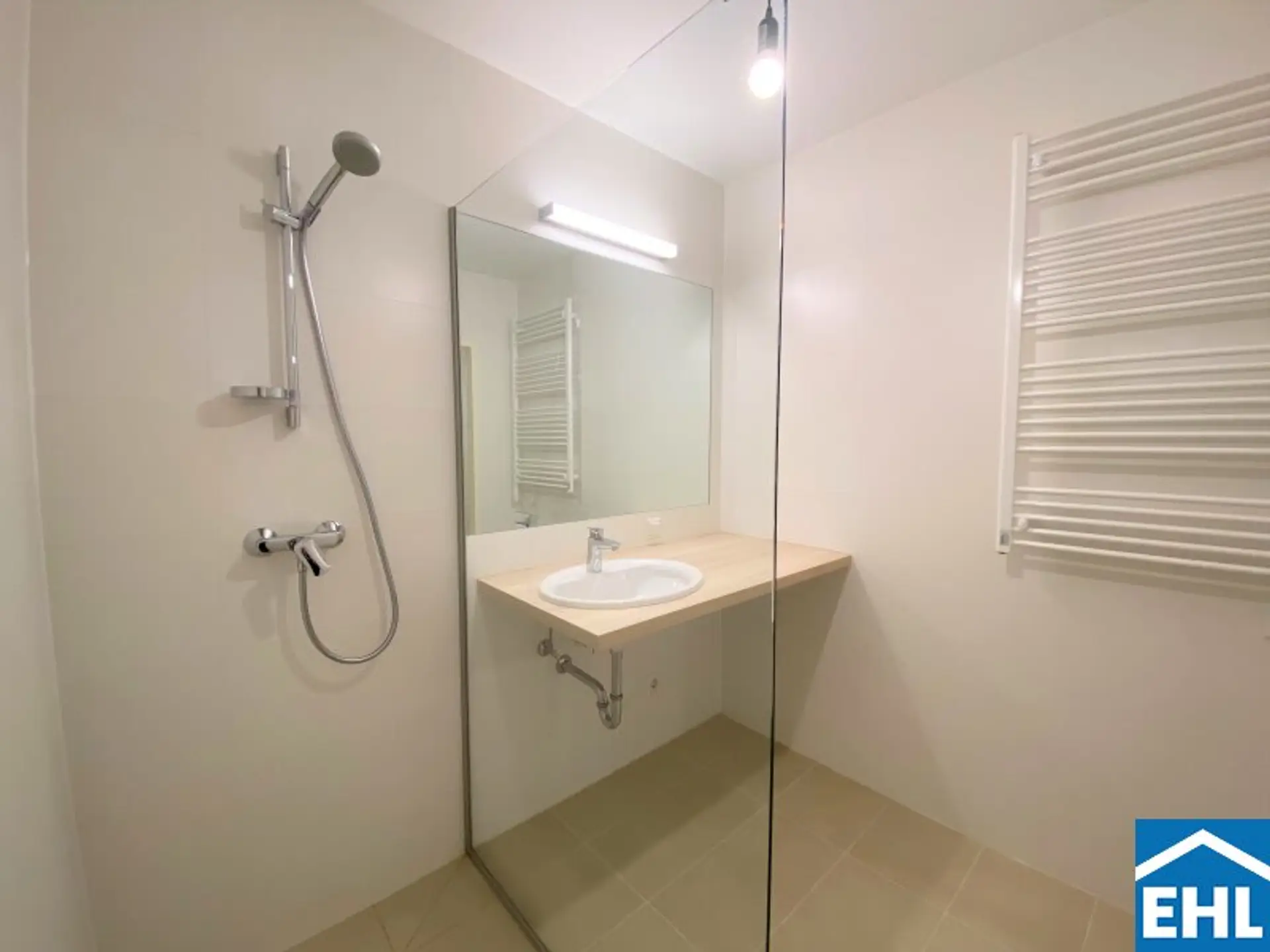 Die Wohnung selbst befindet sich im 1. Obergeschoss und verfügt über eine Wohnküche, ein Schlafzimmer, ein Badezimmer mit Dusche sowie eine separate Toilette und einen Vorraum. Die Loggia rundet das Wohnerlebnis ab.
