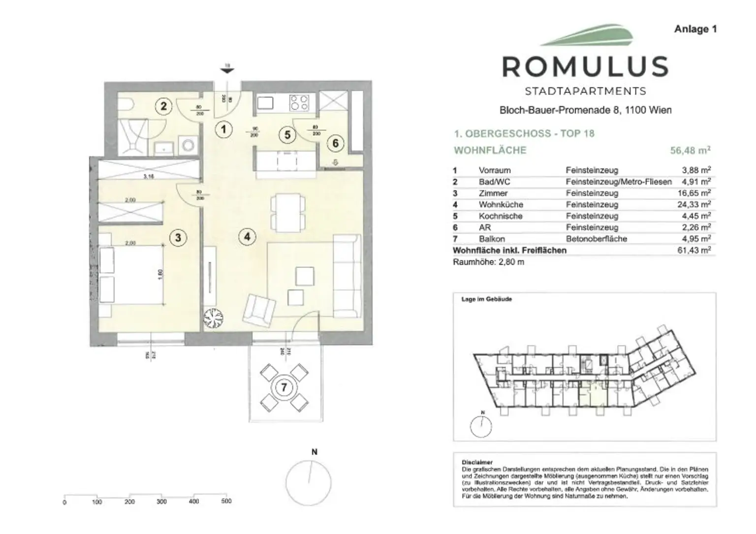 Die 2 Zimmerwohnung mit knapp 56,48m2 Wohnfläche und mit knapp 4,95m2 Balkon liegt im 1.Liftstock und gliedert sich in folgende, tolle Raumaufteilung: