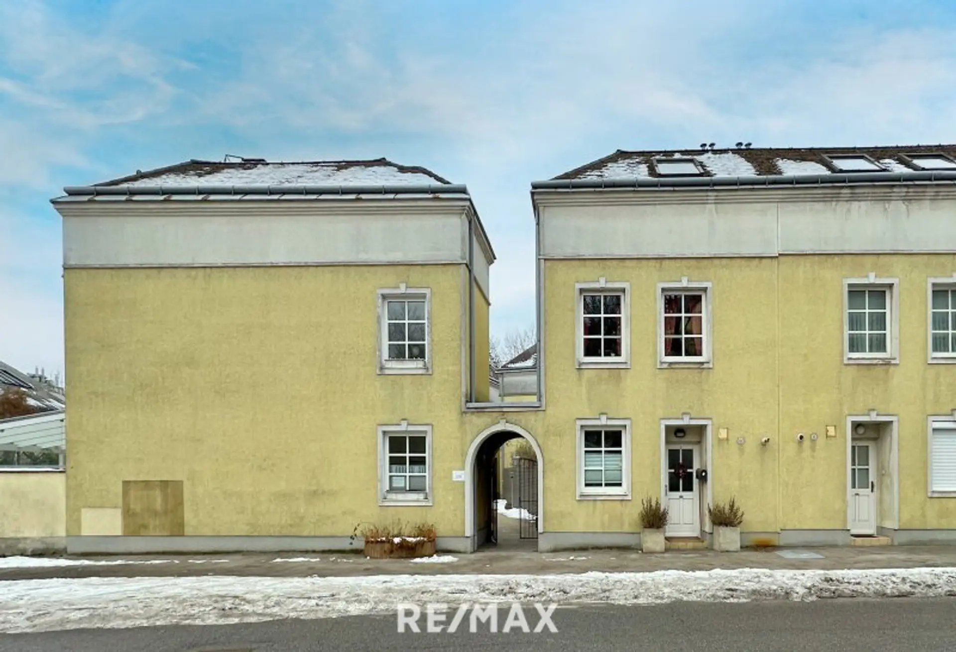 Durch einen Torbogen von der Straße weg kommen Sie ins Innere der Anlage und betreten Ihr Reihenhaus, das Ihnen auf 3 Etagen plus Keller viel Platz bietet: