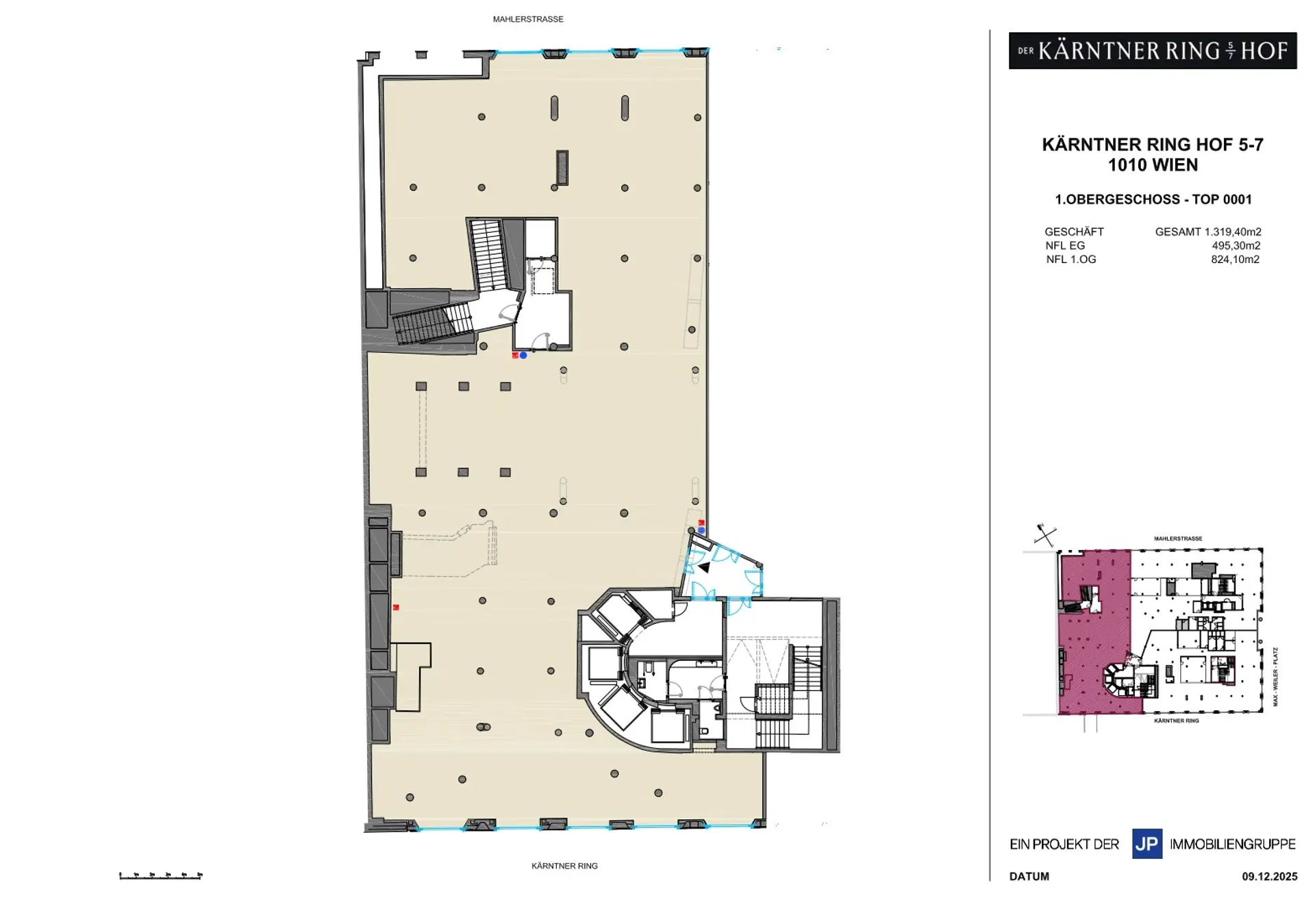 Flächen- und Kostenübersicht Geschoss: 1.OG Top: 1 Fläche: ca. 824,10m² Miete netto/m²/Monat: € 35,00 Betriebskosten und allg.Strom netto/m²/Monat: € 6,20 Heizkosten und WW netto/m²/Monat: € 1,50 Kaltwasser netto/m²/Monat: € 0,30 Kälte netto/m²: € 1,50 Allgemeine Objektbeschreibung Im Herzen der imperialen Pracht Wiens eingebettet, entlang der mondänen Ringstraße und nur einen Spaziergang von der pulsierenden Kärntner Straße entfernt, erstrahlt bald ein Refugium für anspruchsvolle Unternehmen. In unmittelbarer Nachbarschaft zur Wiener Staatsoper, wo Kultur und Geschichte auf einzigartige Weise verschmelzen, erlebt der traditionsreiche Kärntnerringhof eine Metamorphose zu einem Zentrum moderner Arbeitswelten. Das Gebäude wird umfangreich saniert und modernisiert, so entstehen hier beispielsweise im ehemaligen Mallbereich im 1. Obergeschoß moderne, neue Büroflächen. Der Hauptzugang zu den Büros befindet sich am Kärntner Ring. Ein Portier steht hier zu Bürozeiten den Besuchern für Auskünfte zur Verfügung. Das Untergeschoß und das Erdgeschoß werden nach Abschluss der Umbauarbeiten neuen Nutzungen zugeführt. So entstehen hier beispielsweise im Erdgeschoß von außen zugängliche neue Retail- und Gastronomieflächen. Auf einer Gesamtfläche von rund 4.200 m² entstehen im Kärntnerringhof nicht einfach nur Büroflächen – es werden inspirierende Environments geschaffen, die höchsten Ansprüchen an Ästhetik und Funktionalität genügen. Weiters entstehen auch ca. 2.000 m² neue Retailflächen im Erdgeschoß und teilweise im 1.OG. Im Herbst 2026 öffnen sich hier die Tore zu diesen exklusiven Räumlichkeiten. Stellen Sie sich vor: repräsentative Adresse, lichtdurchflutete Bbereiche und eine Infrastruktur, die den Anforderungen einer modernen Geschäftswelt in jeder Hinsicht gerecht wird. Über das Hauptstiegenhaus werden alle Geschoße des Gebäudes mit insgesamt vier Liftfanlagen barrierefrei erschlossen. Nutzen Sie die Gelegenheit und sichern Sie sich diese exklusive Geschäftsfläche. Befristung: 10 Jahre Kündigungsverzicht: 3-5 Jahre Kaution: 3-6 BMM Provision: 3 BMM Verfügbar ab: Q4 2026 Ausstattung -Je Mieteinheit 1x Anschluss Heizung, 1x Anschluss Kälte, 1x Anschluss Kaltwasser von der hauseigenen Ringleitung; jeder Anschluss mit Zählern (bzw. vorläufig Passstücken), Absperrungen und Entleerungen, Dimensionen gemäß gewerbeüblichen Erfordernissen; Lage: am jeweiligen Eintritt zur Mieteinheit. - Heizung / Warmwasser Wärmeerzeugung/-bereitstellung durch Fernwärme Wien. Die Warmwasseraufbereitung erfolgt dezentral durch Untertischspeicher oder Warmwasserboiler, welche vom Mieter innerhalb seiner Mieteinheit herzustellen sind. - Kältetechnik Anbindung an die bestehende, zentrale Klimakaltwassererzeugung durch wassergekühlte Kältemaschinen in Verbindung mit Trockenrückkühlern. Kälteversorgung (Kühlwasser zur Raumkühlung): Pumpenkaltwasser von objekteigener Kälteerzeugung - lichte Raumhöhen 2,50m - 2,80m - Heizung und Kühlung über Decken- Fan Coils, die Mietersiets in die Zwischendecke eingebaut werden kann Parken Hauseigene Tiefgarage (ca. 750 Stellplätze) Energieausweis HWB: 54 kWh/m².a Lage Schon bei Ihrer Ankunft werden Sie die Bequemlichkeit der vorhandenen Parkmöglichkeiten zu schätzen wissen. Darüber hinaus ist der Karlsplatz Wiens größtes U-Bahn-Drehkreuz und der einzige Knotenpunkt mit drei U-Bahn-Linien und gewährt somit durch die unmittelbare Nähe zu Bus- und Straßenbahnhaltestellen eine nahtlose Anbindung an das pulsierende Herz der Stadt. Nur einen Steinwurf, genauer gesagt nur zwei Minuten, trennen Sie von der legendären Wiener Staatsoper, einem Ort, der Kultur und Geschichte. Die erstklassige Infrastruktur dieser Gegend lässt keine Wünsche offen. Inmitten dieses urbanen Juwels sind zahlreiche exquisite Geschäfte und einladende Restaurants bequem zu Fuß erreichbar, sodass Sie die Annehmlichkeiten des städtischen Lebens in vollen Zügen genießen können. Öffentliche Verkehrsanbindung U-Bahn: U1,U4, U2 Straßenbahn: 5, 33, 37, 38, 40, 41, 42 und 43 Bus: 2A, 48A, 4A, 59A, 77A Badner Bahn Ansprechpartner: Frau Kathrin Fercher Tel.: +43 (1) 596 60 20 0 Mehr Objekte finden Sie unter: www.jpi.at Wir haben was für Sie Wir weisen darauf hin, dass wir mit dem Abgeber in ständiger Geschäftsbeziehung stehen und schon aus diesem Grund ein wirtschaftliches Naheverhältnis vorliegt.