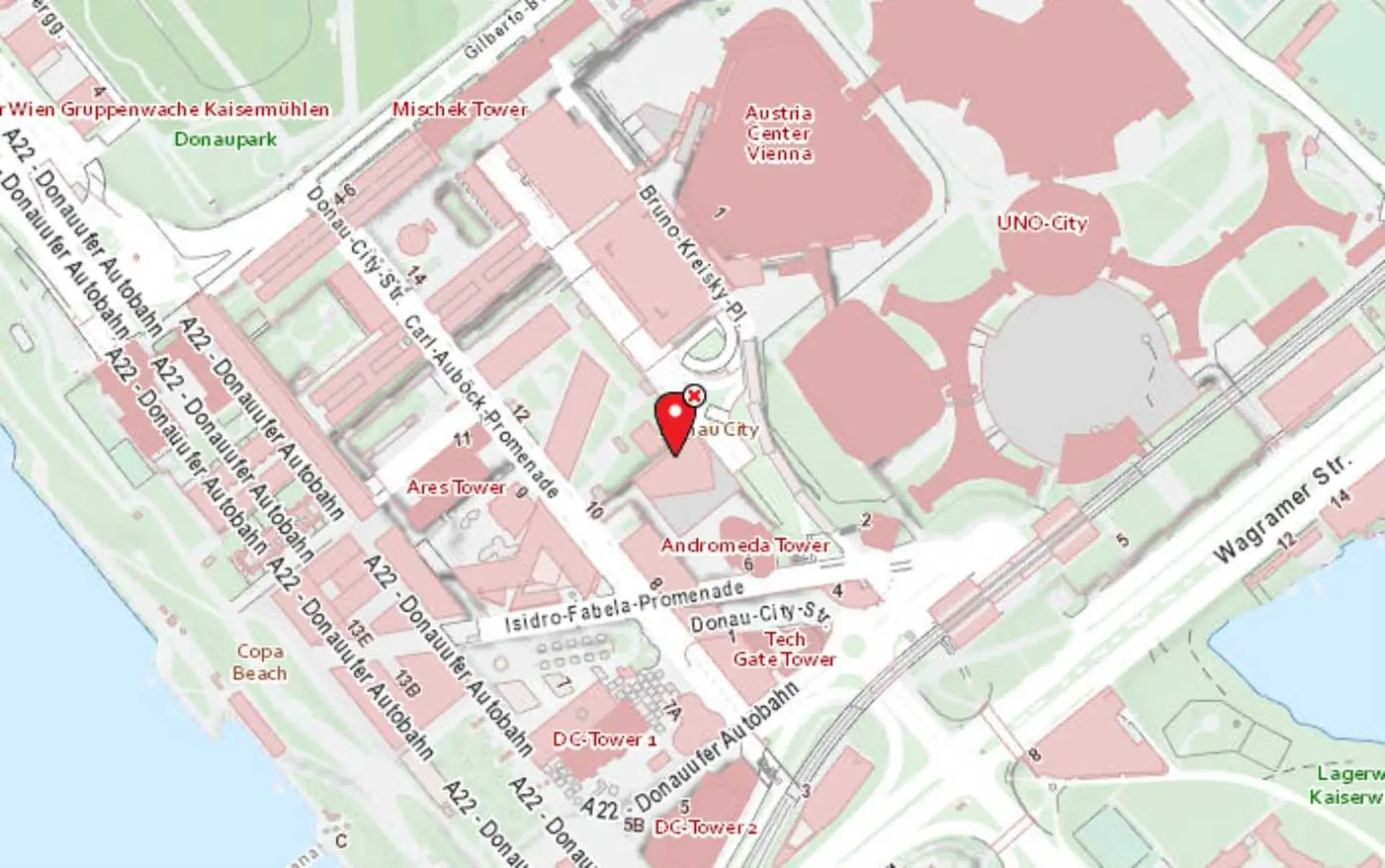 Das Objekt liegt im modernen Stadtteil Donau City im 22. Wiener Gemeindebezirk. Die Lage zeichnet sich durch ihre unmittelbare Nähe zur Donau und zum Donaupark aus, was eine hohe Aufenthaltsqualität im direkten Umfeld schafft.
