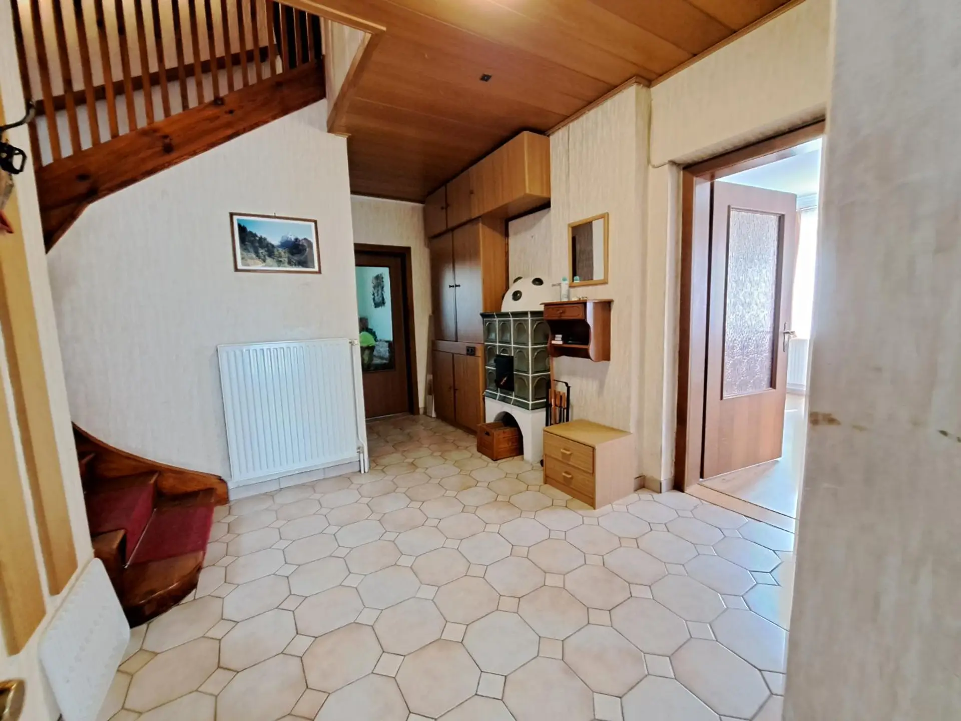 Zunächst findet man hier einen Eingangsbereich mit separatem WC. Danach betreten wir das Vorzimmer mit einer Holz-Treppe ins OG und einem Heizbereich für den im Wohnzimmer liegenden Kachelofen und eine kleine Speis.