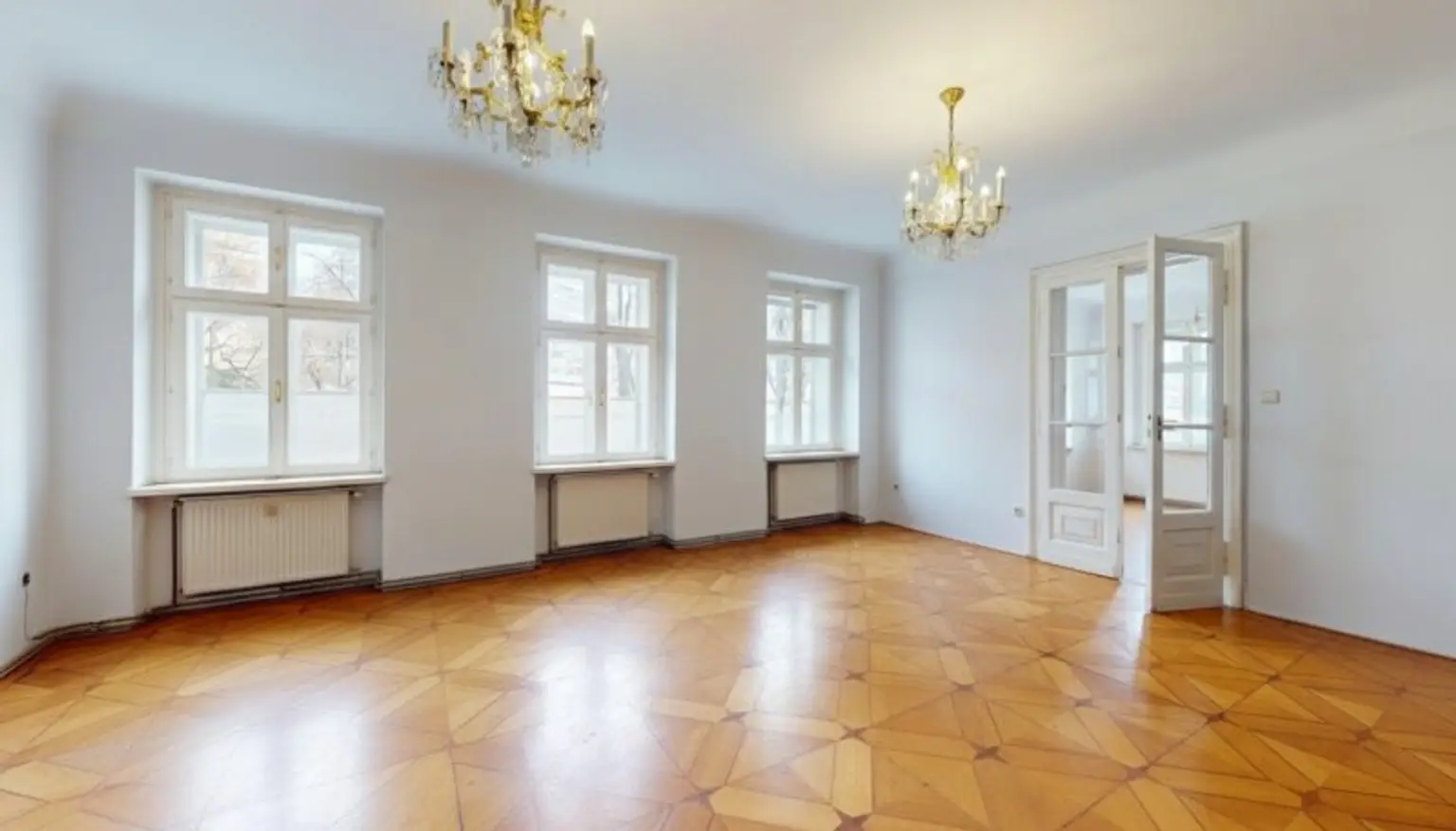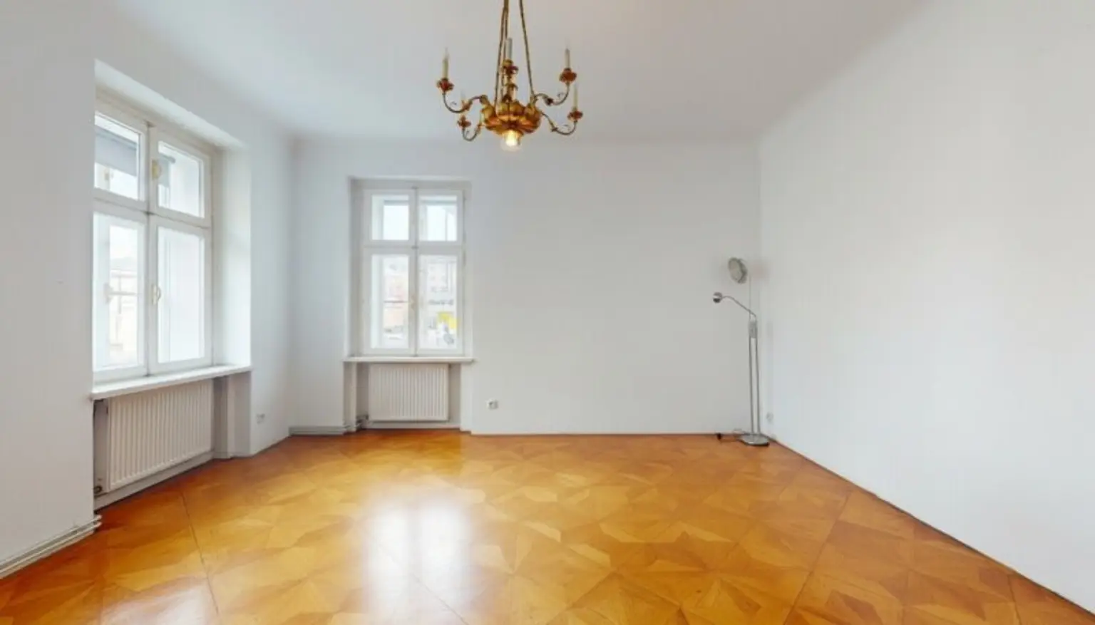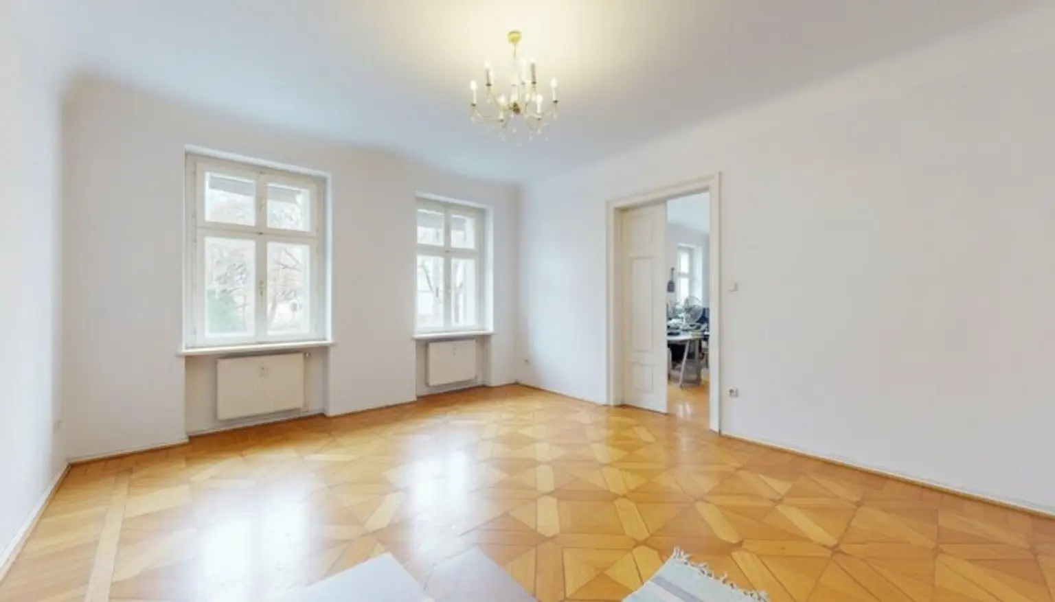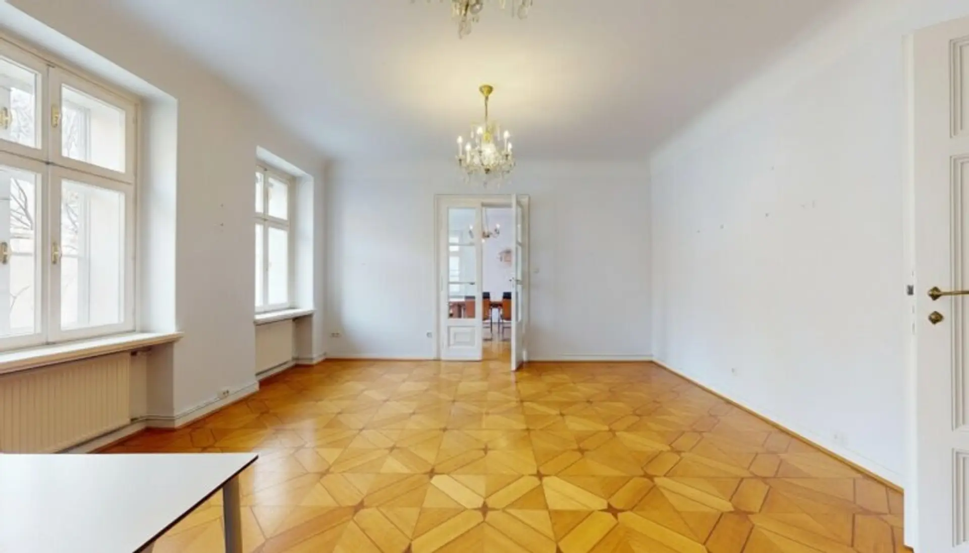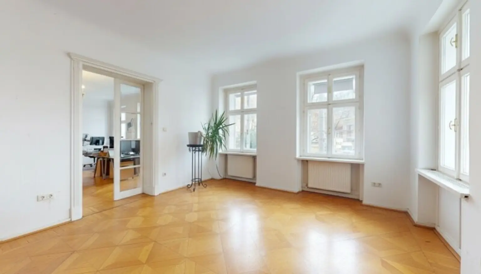 Klassische Wiener Architektur, eleganter Sternparkettboden und ein gepflegtes Gesamtbild verleihen der Fläche Charakter, Wiedererkennungswert und eine angenehme Arbeitsatmosphäre.
