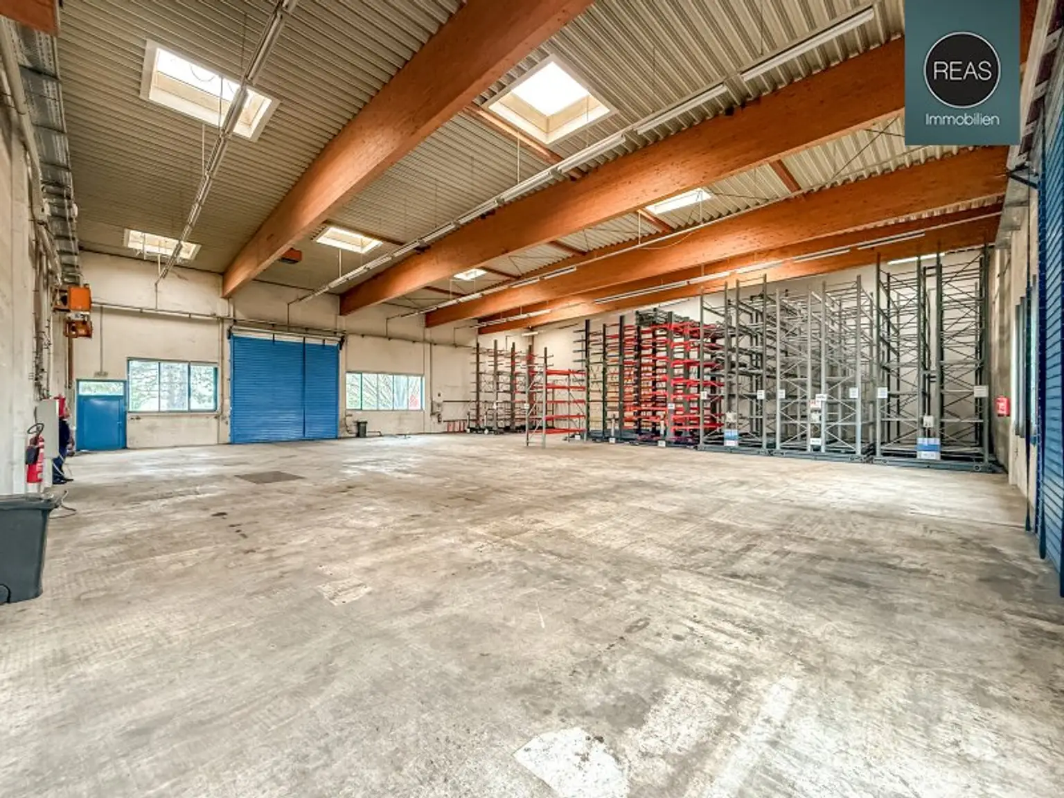 * Halle mit Fenstern und großem Einfahrtstor