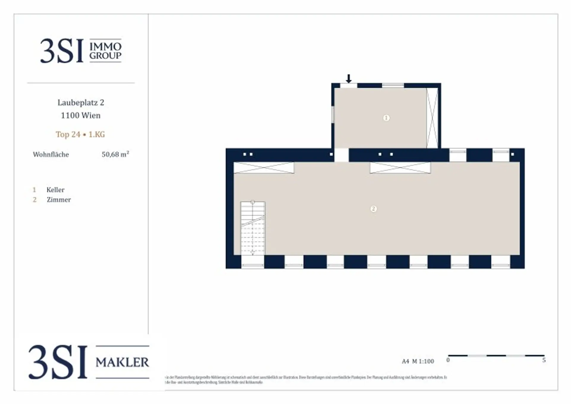 Zum Verkauf gelangt eine Lagerfläche mit knapp 124m² im Souterrain. Die Einheit besitzt auch einen straßenseitigen Zugang über einen Treppenabgang.