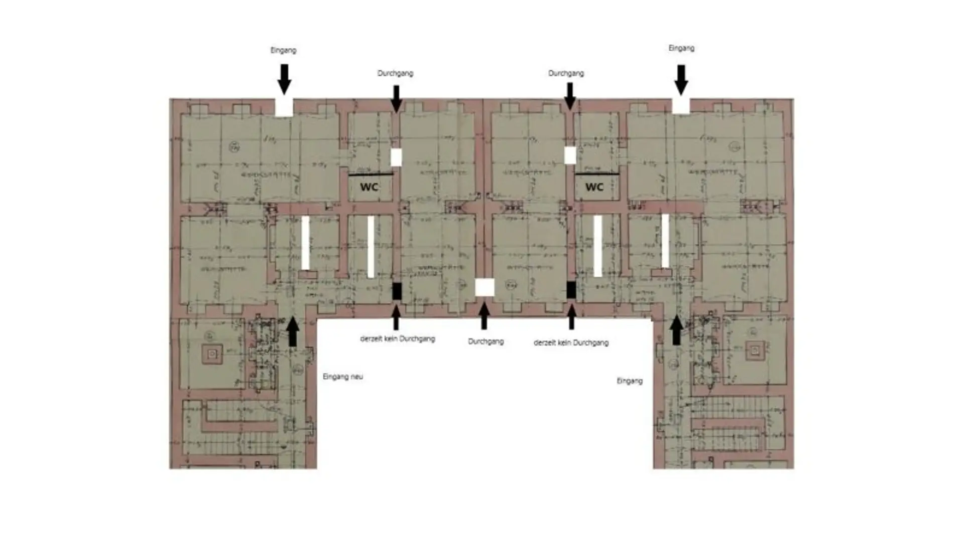 Derzeit verfügt das Objekt über 8 große Gewölbe-Räume (mit 1-2 Fenster), die teilweise offen gestaltet sind und teilweise mit Türen verbunden sind sowie 6 weitere, kleinere Räume (teilweise mit Fenster).