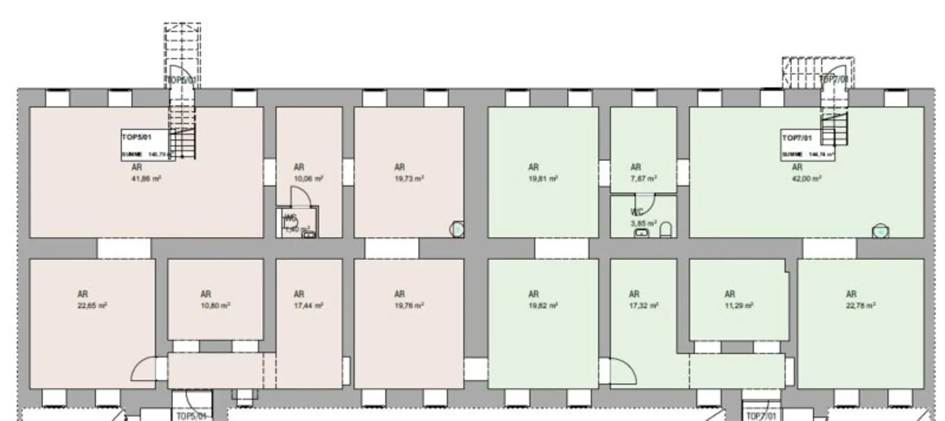 Derzeit verfügt das Objekt über 8 große Gewölbe-Räume (mit 1-2 Fenster), die teilweise offen gestaltet sind und teilweise mit Türen verbunden sind sowie 6 weitere, kleinere Räume (teilweise mit Fenster).