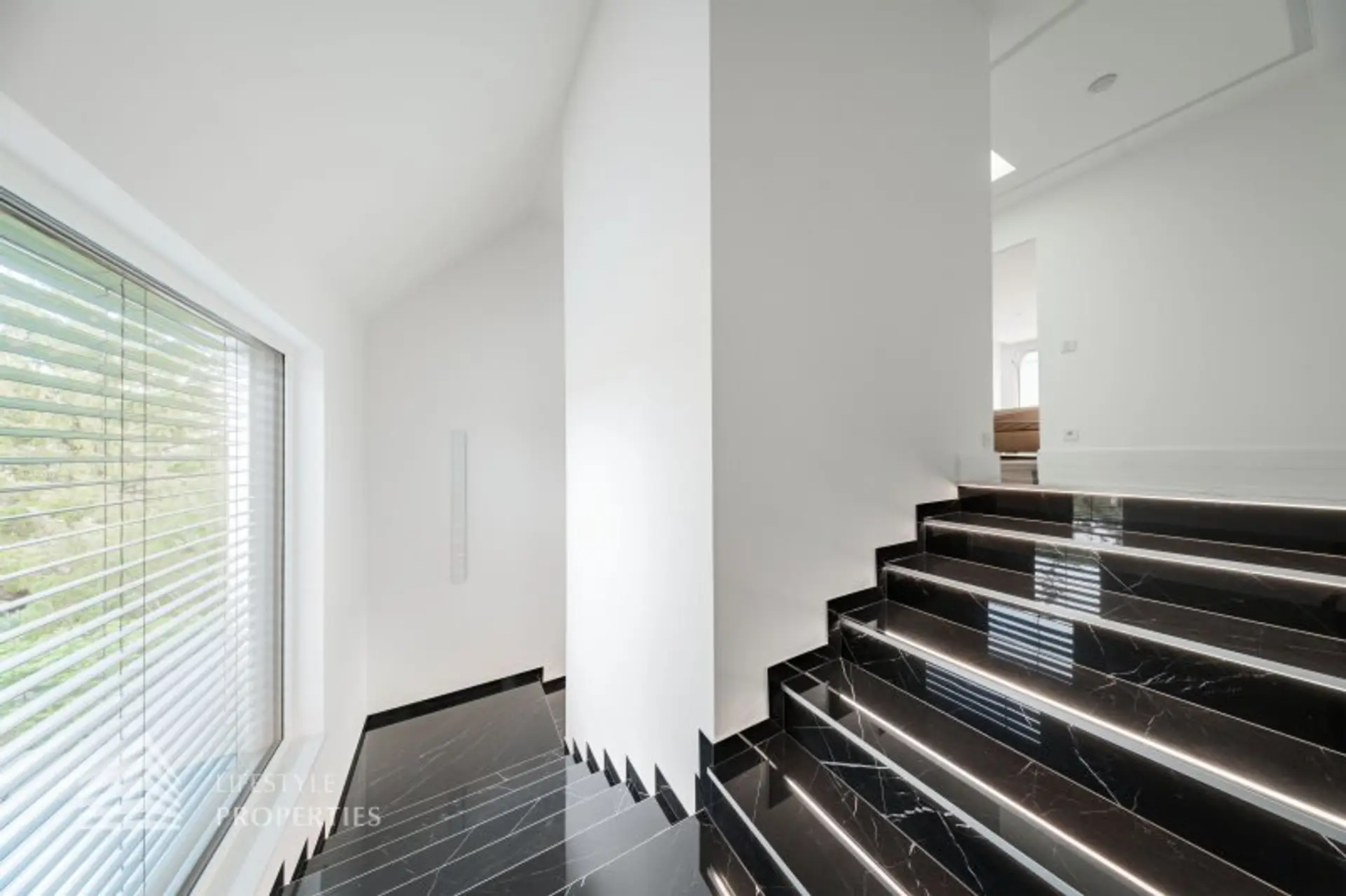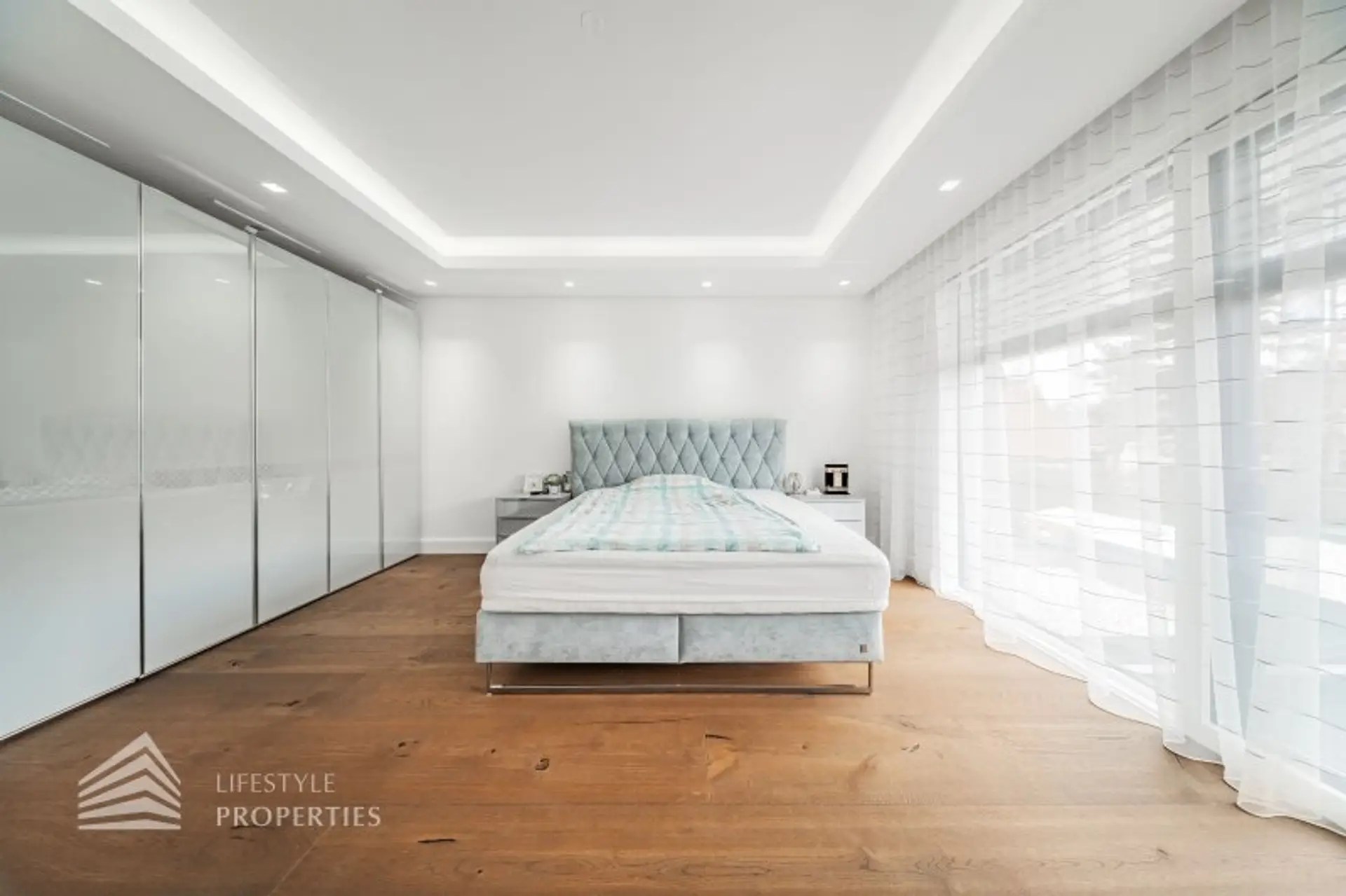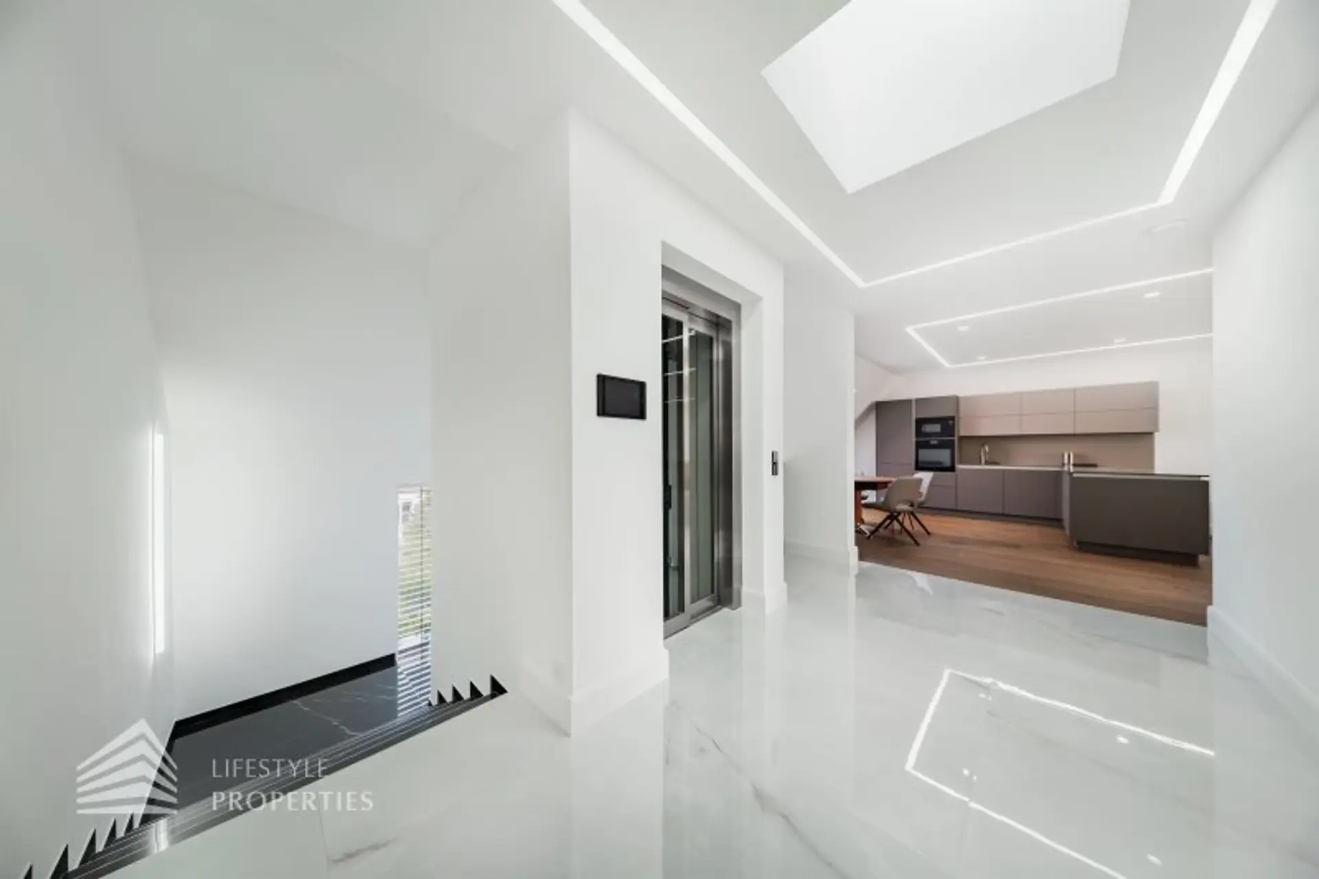 Im Innenbereich verschmelzen edelste Materialien zu einem harmonischen Gesamtbild. Fenster- und Portalsysteme von Josko mit elektrischen Raffstores, maßgefertigtes Schweizer Sonderparkett in 2,5 cm Stärke sowie großformatige italienische Designfliesen im Format 1,5 x 3 Meter setzen ein klares Zeichen kompromissloser Qualität. Zwei exklusive Designküchen mit internationalen Markenmöbeln von Natuzzi und Joop! unterstreichen den gehobenen Lifestyle-Charakter dieser Residenz.