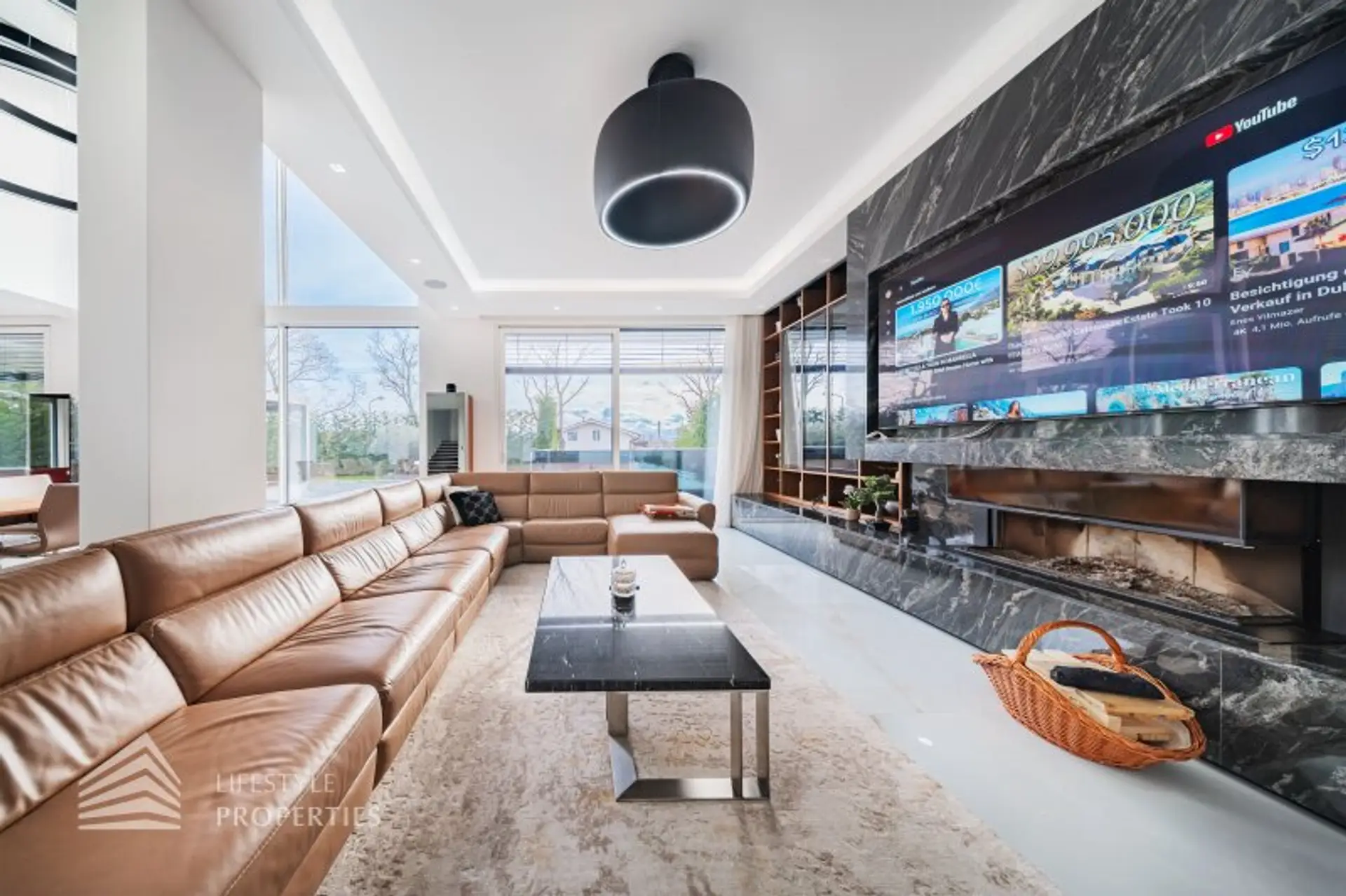 Der repräsentative Wohnbereich wird von einem großen Designkamin mit Natursteinverkleidung stilvoll inszeniert und öffnet sich harmonisch zur großzügigen Terrassenlandschaft. Innen- und Außenbereich gehen fließend ineinander über und schaffen ein Wohnerlebnis auf Resort-Niveau.