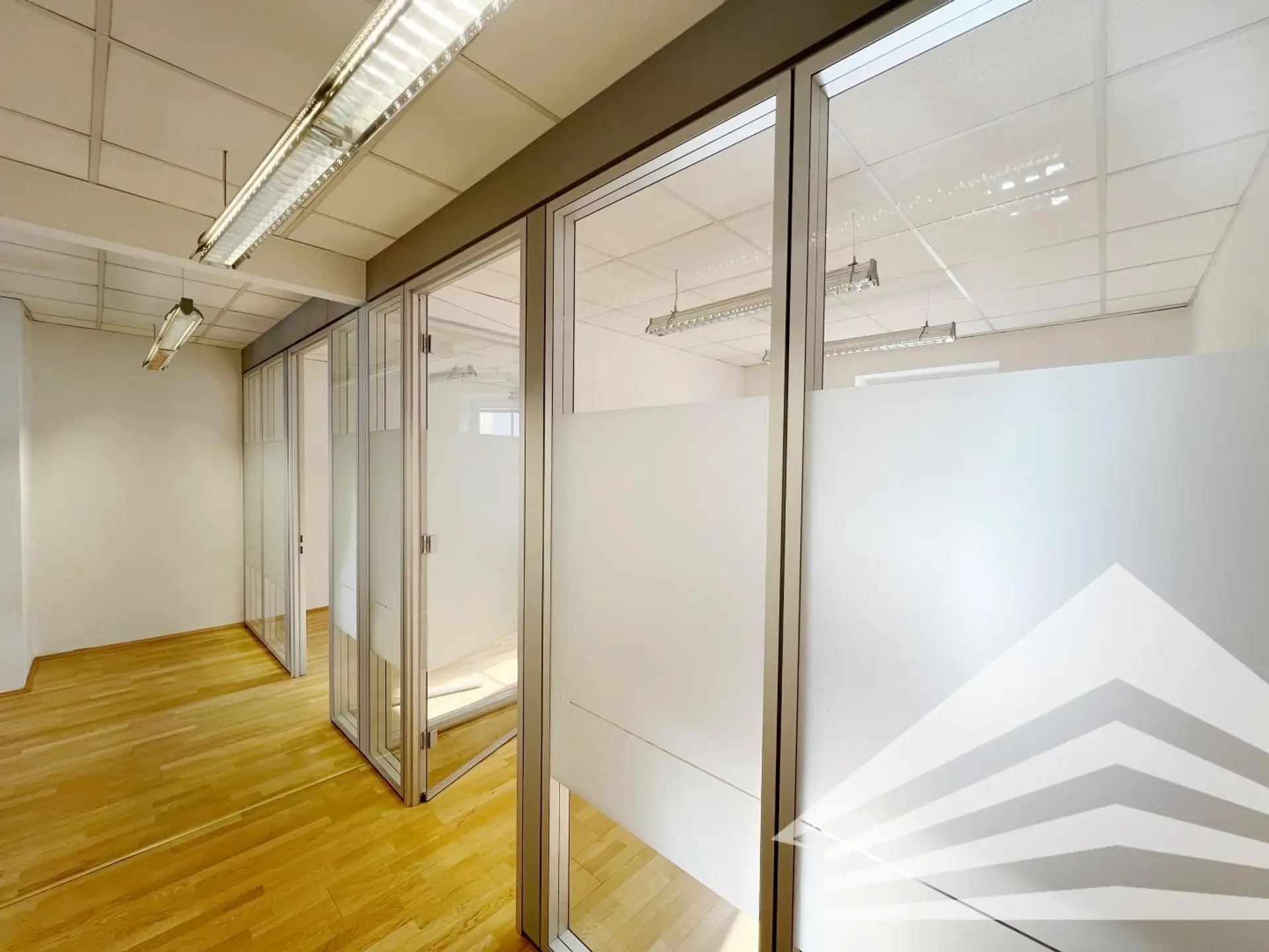 In diesem Bürohaus mit gesamt ca. 600 m² Büronutzfläche besteht die Möglichkeit abgetrennte Büroeinheiten zwischen ca. 31 m² und ca. 210 m² Nutzfläche anzumieten. Die beschriebene Einheit liegt im Hochparterre des Gebäudes und besteht aus 7 Räumen zwischen ca. 13 m² und ca. 43 m².