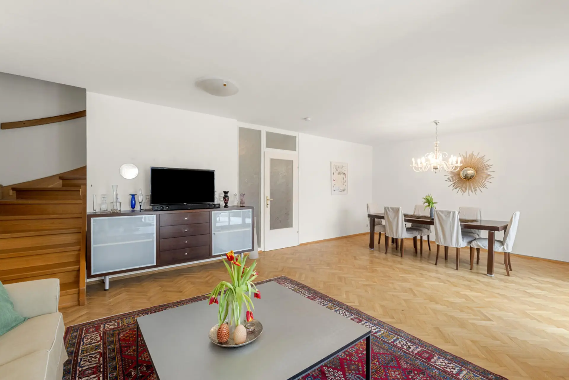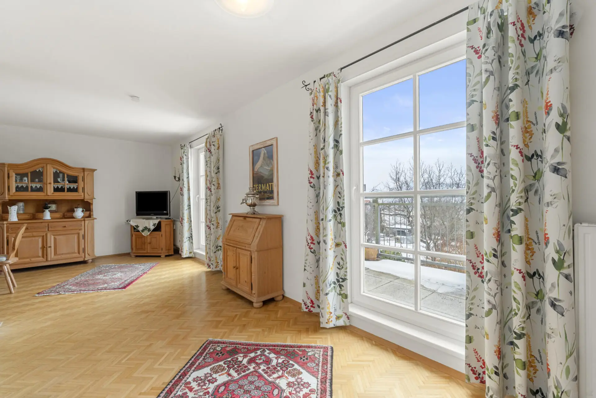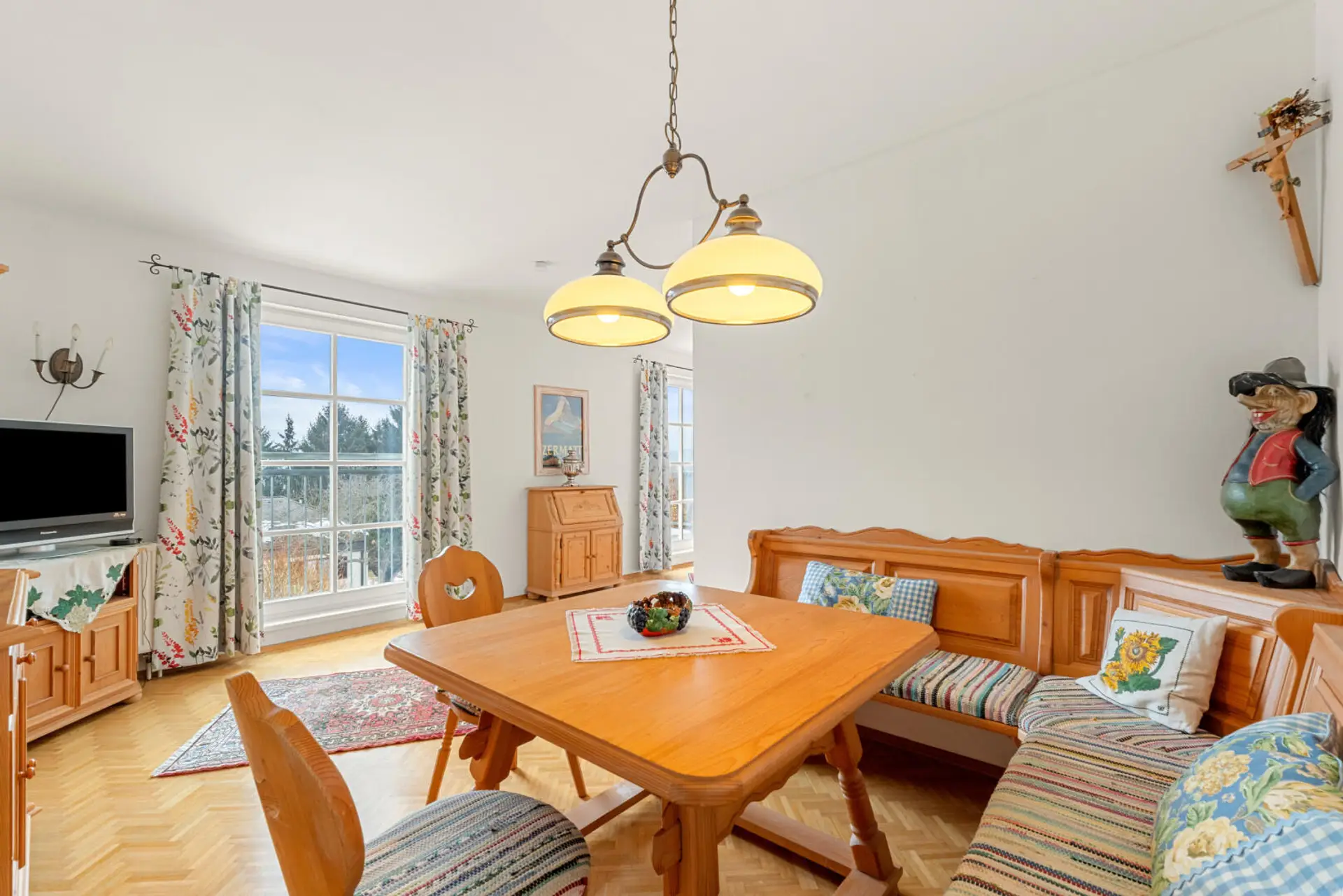 Die Liegenschaft bietet rund 158 m² Wohnfläche und überzeugt durch einen durchdachten Grundriss, der dem Haus Charakter und Großzügigkeit verleiht. Über den Windfang im Erdgeschoss gelangt man über wenige Stufen in den Flur, von wo aus man das WC sowie die Küche erreicht und weiter in den offen gestalteten Wohn-Essbereich gelangt. Große Fensterflächen schaffen eine helle, freundliche Atmosphäre und eröffnen einen schönen Ausblick, der bis zur Kirche St. Veit und die dahinterliegende Bergwelt reicht. Die vorgelagerte Terrasse erweitert den Wohnraum ins Freie und führt in den etwa 80 m² großen Garten, der ausreichend Platz für Erholung, Spielen oder gesellige Stunden im Grünen bietet.