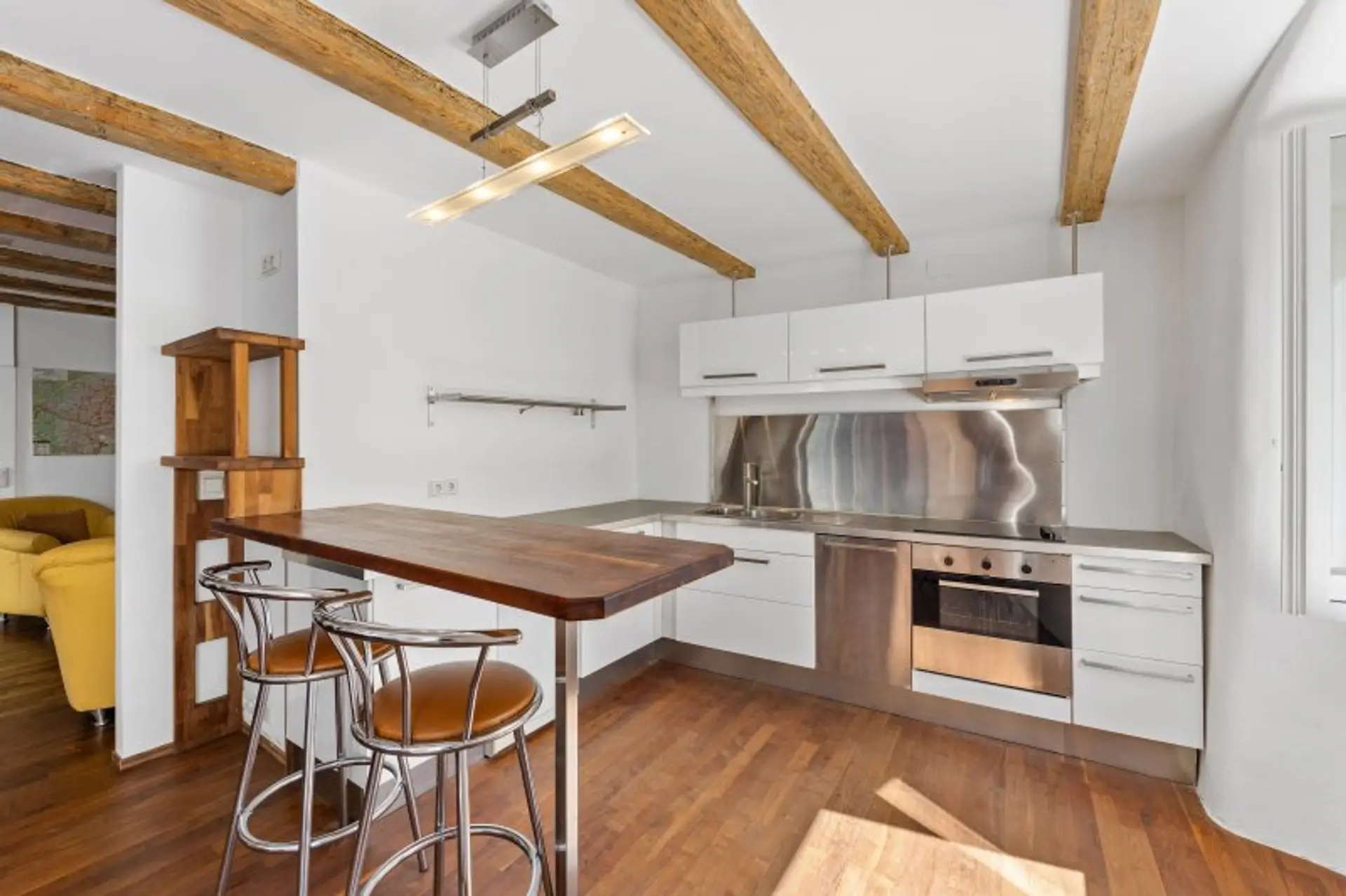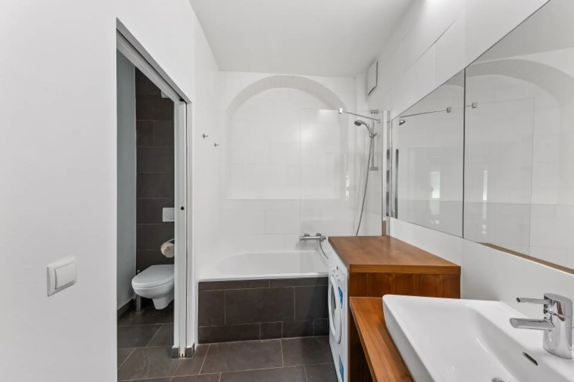 Der Zugang erfolgt über den Innenhof im Erdgeschoß und bietet beim Betreten einen leicht abgegrenzten Eingangsbereich mit ausreichend Fläche für eine Garderobe. Weiter gelangt man in einen großen offenen Bereich, der viel Platz für Arbeitsplätze oder einen Wohnbereich bietet. Angeschlossen ist eine offene Küche samt Einbauküche inkl. Geräten und einer Bar-Theke. Weiters steht ein zusätzliches separates Zimmer zur Verfügung, das ebenfalls einen eigenen Zugang zum Innenhof bietet. Das Bad hat zwei Zugänge und ist mit Wanne, Waschtisch, Waschmaschinen-Anschluss sowie der Therme ausgestattet. Das WC ist mittels einer Schiebetür zu separieren. Es stehen insgesamt knapp 61 m2 zur Verfügung.