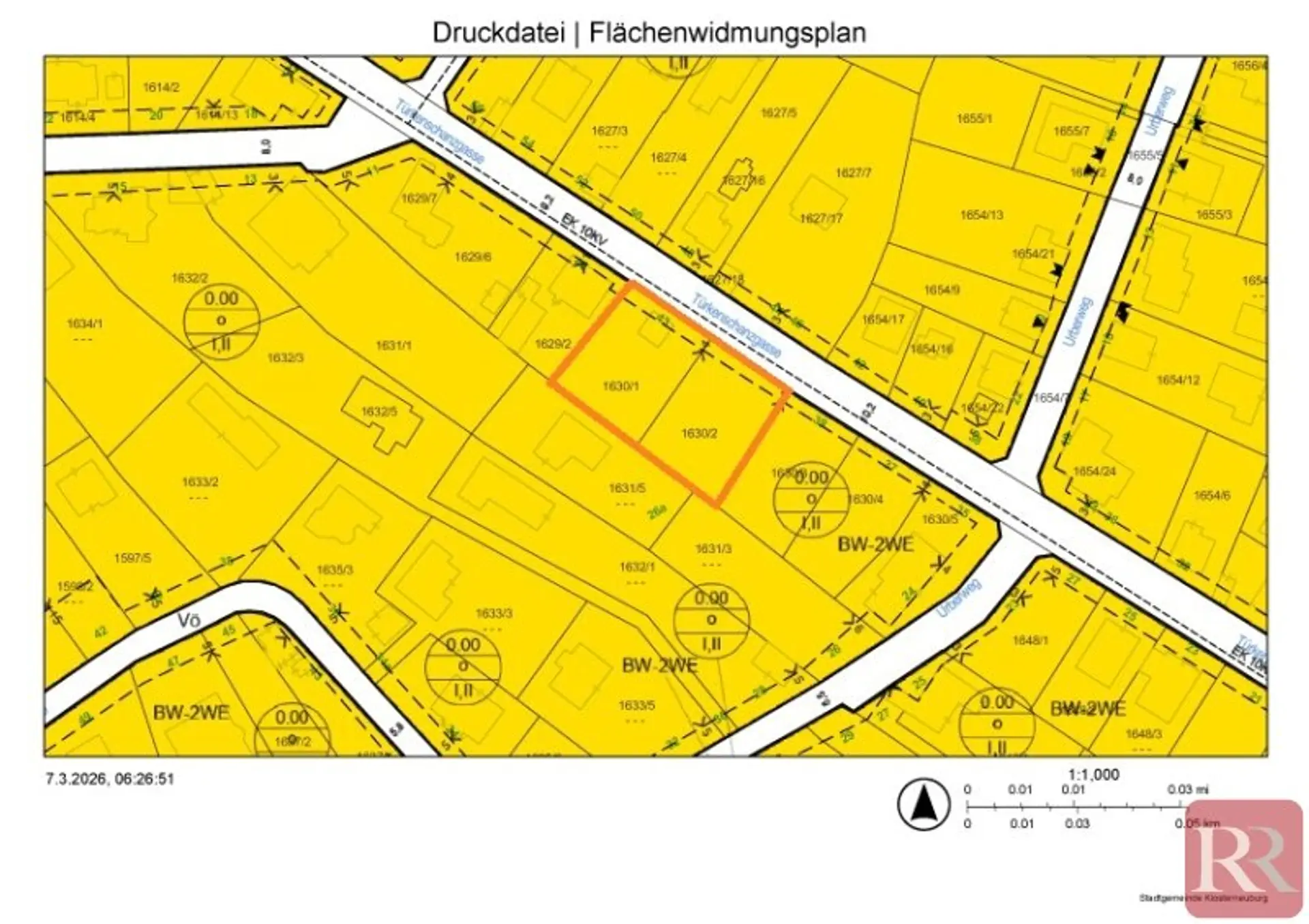 Das Grundstück umfasst eine Gesamtfläche von ca. 1.341 m² und besteht aus zwei nebeneinanderliegenden Parzellen. Es ist gemäß Flächenwidmung in Bauklasse I und II bei offener Bauweise gewidmet. Derzeit sind es 2 Parzellen - diese können aber auch zusammengelegt werden.