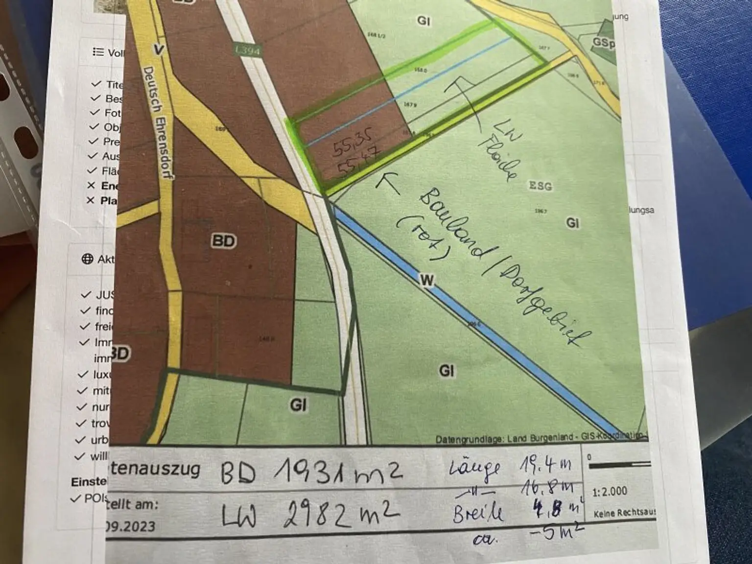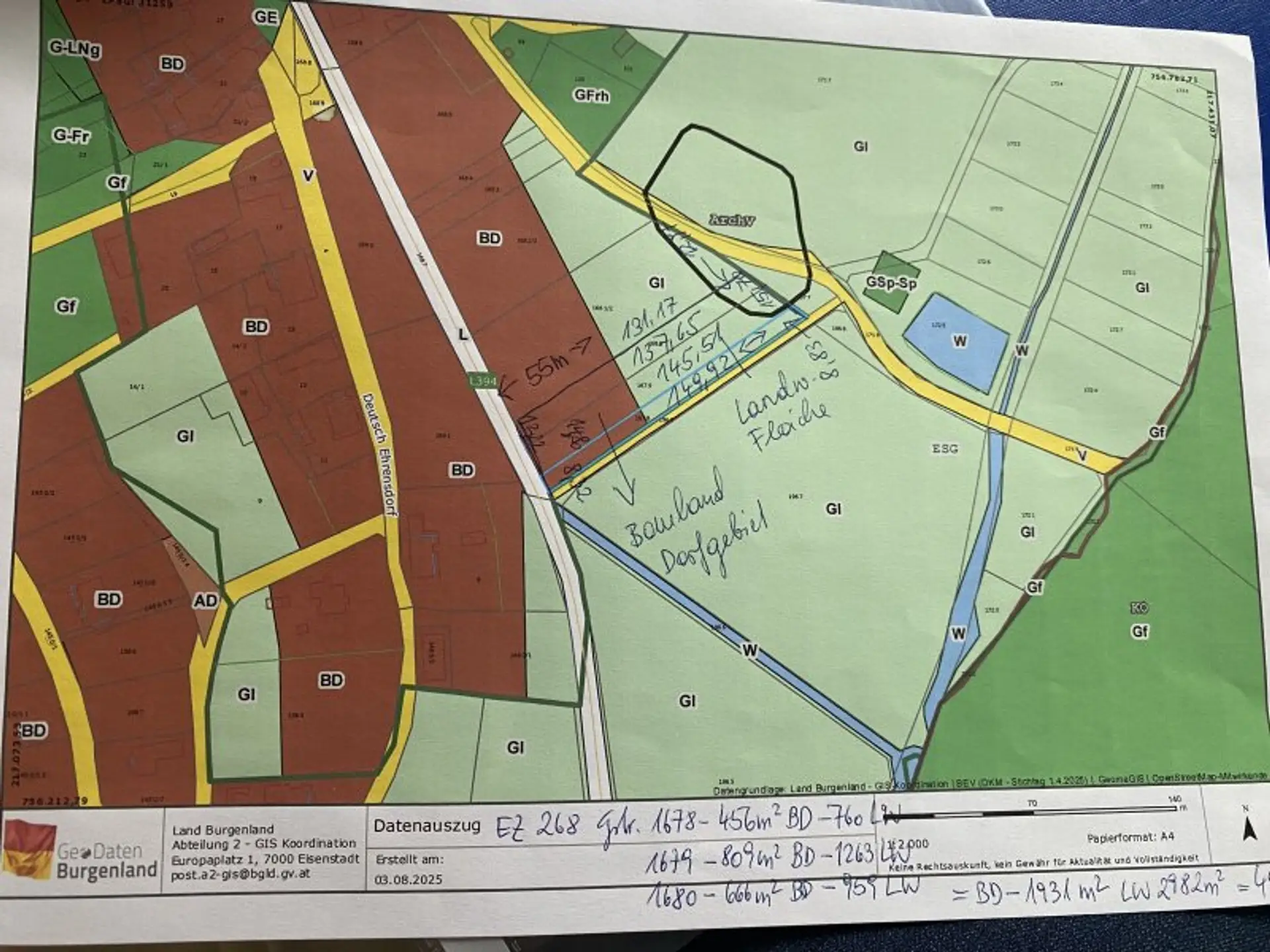 Das 4913 m2 große Grundstück unterteilt sich in 1931 m2 Bauland und 2982 m2 Grünfläche. Durch diese Widmung ist Wohnbau und auch Tierhaltung, Gartennutzung oder einfach eine Blumenwiese möglich.