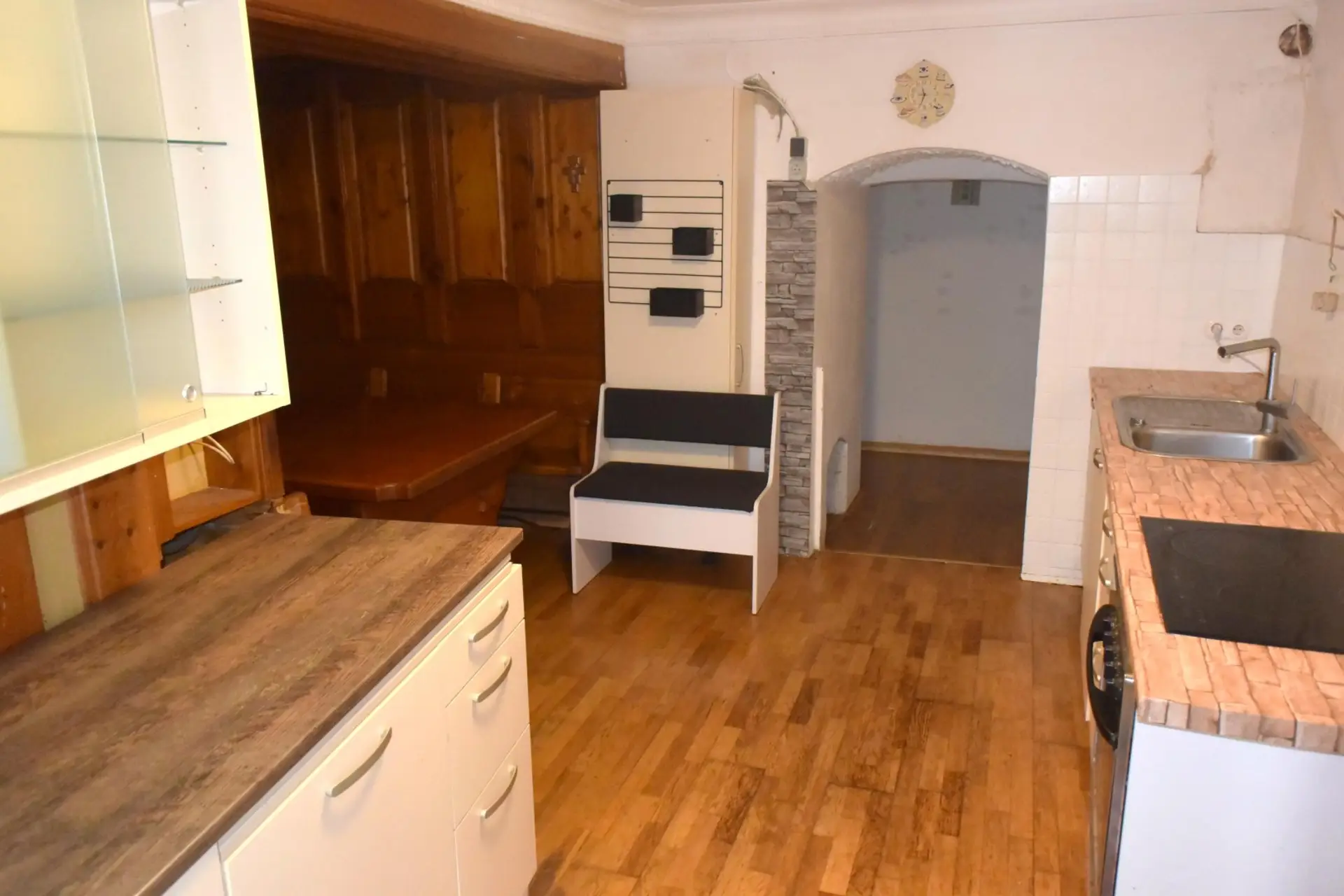 Vorraum, Küche mit Essecke, großzügiges Wohnzimmer mit alter Holzdecke, 3 Schlafräume, Bad (Dusche und Wanne, WC, Bidet), WC.