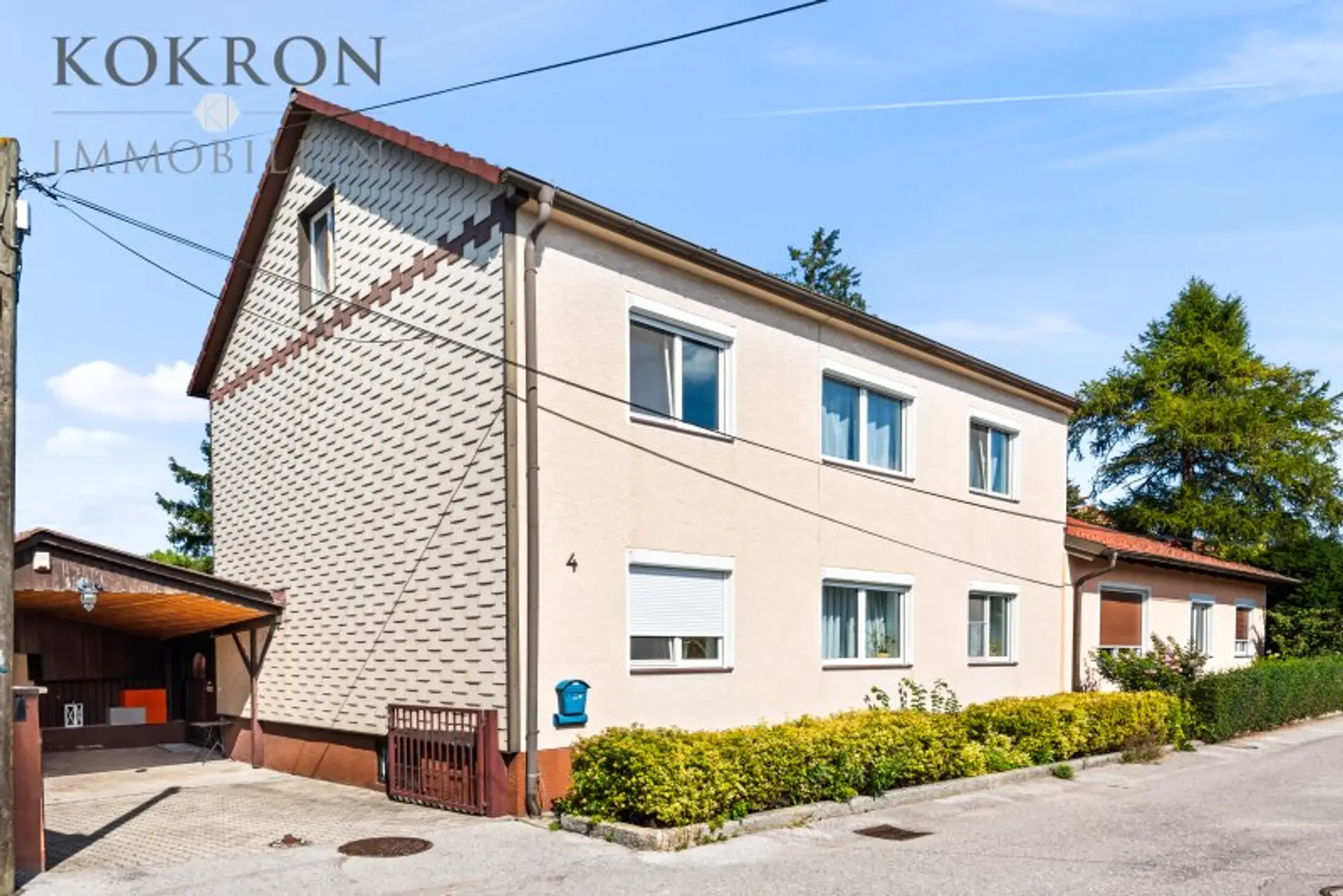 Von der Straße gelangen Sie über einen überdachten Autoabstellplatz, wo sich auch die Einfahrt in die Garage befindet, in einen lichten und überdachten Eingangsbereich vor dem Haus. Von Hier gelangen Sie in den Vorraum des Hauses, in einen Teil des Hauskellers und in den Garten.