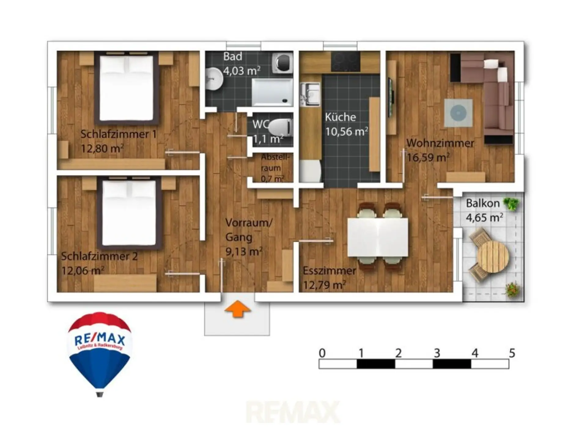 Die Wohnung verfügt über eine Wohnfläche von rund 80 m² und überzeugt durch eine sehr praktikable Raumstruktur, welche sowohl für Familien als auch für Paare mit Platzbedarf eine attraktive Lösung darstellt. Die dreiseitig offene Ausrichtung anhand der Gebäudestruktur verschafft dieser Wohnung eine sehr helle und warme Präsenz.
