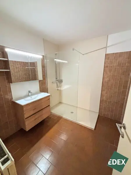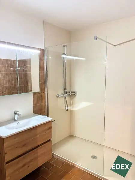 Badezimmer mit Waschbecken, Unterschrank, Spiegelkasten und Dusche (2025 renoviert)