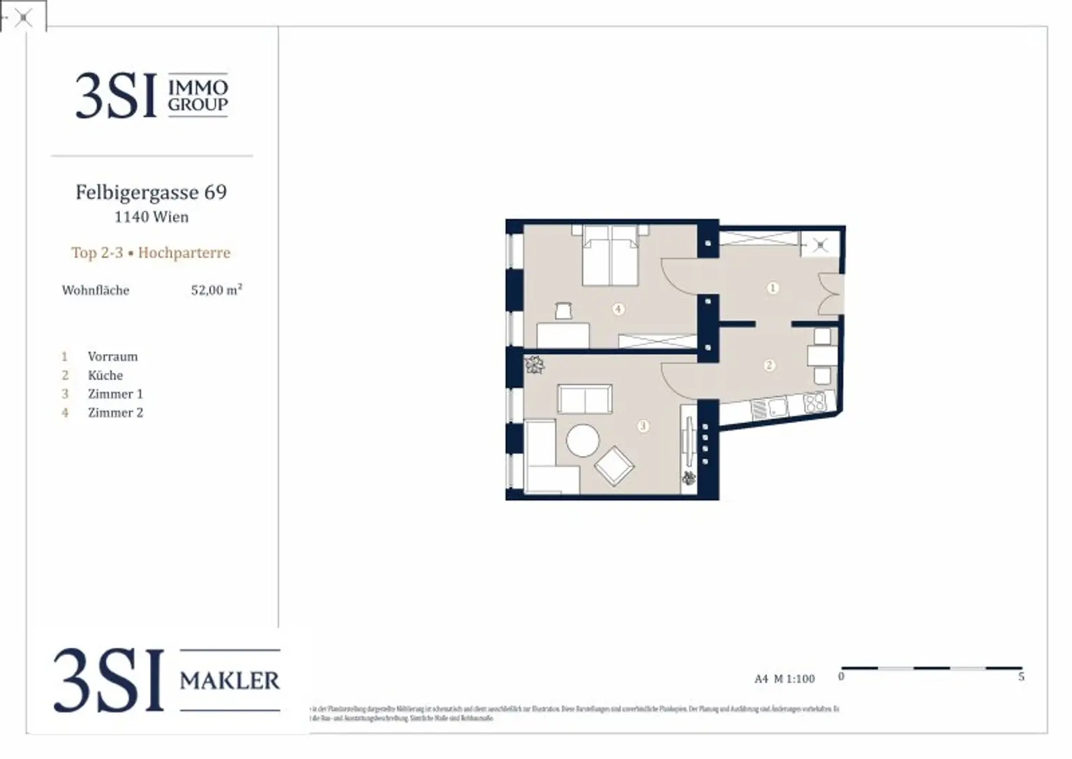 In der Felbigergasse 69 im 14. Wiener Gemeindebezirk gelangt diese ca. 52 m² große Wohnung (Top 2–3) im Hochparterre zum Verkauf. Die Wohnung verfügt über einen Vorraum, eine separate Küche sowie zwei Zimmer und bietet damit eine gut nutzbare und klassische Raumaufteilung.