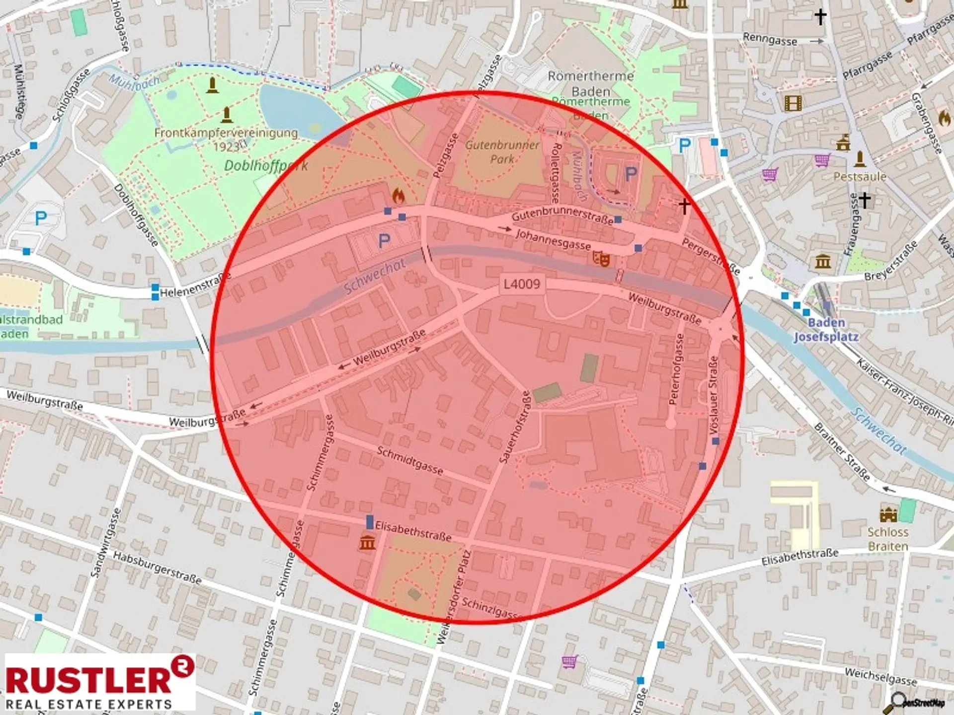 Die Wohnungen überzeugen durch ihre hervorragende Lage in Baden. Das Stadtzentrum mit seinen zahlreichen Restaurants, Cafés und Nahversorgern ist in nur rund 10 Gehminuten bequem erreichbar. Für Erholung im Grünen sorgen mehrere Parks in der Umgebung – der Kurpark, der Dobelhofpark und der Gutenbrunner Park liegen jeweils nur etwa 15 Gehminuten entfernt.