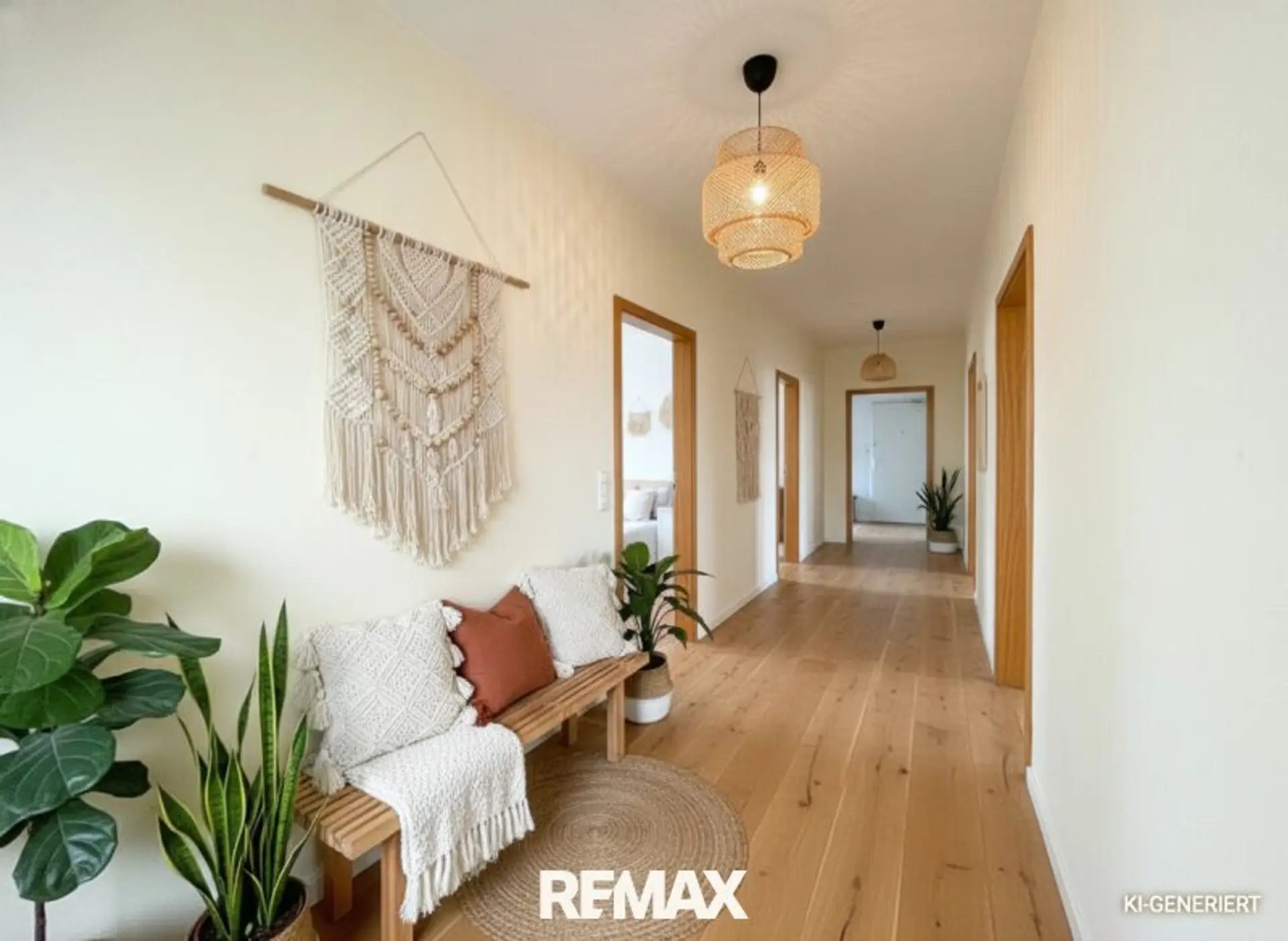 Die Dachgeschosswohnung erstreckt sich über eine Wohnfläche von rund 107 m² und überzeugt durch eine klare, funktionale Raumaufteilung. Sämtliche Räume sind zentral vom großzügigen Flur aus begehbar, was nicht nur die Orientierung erleichtert, sondern auch eine flexible Nutzung ermöglicht, ebenso ideal für Familien, Paare oder eine Wohngemeinschaft.