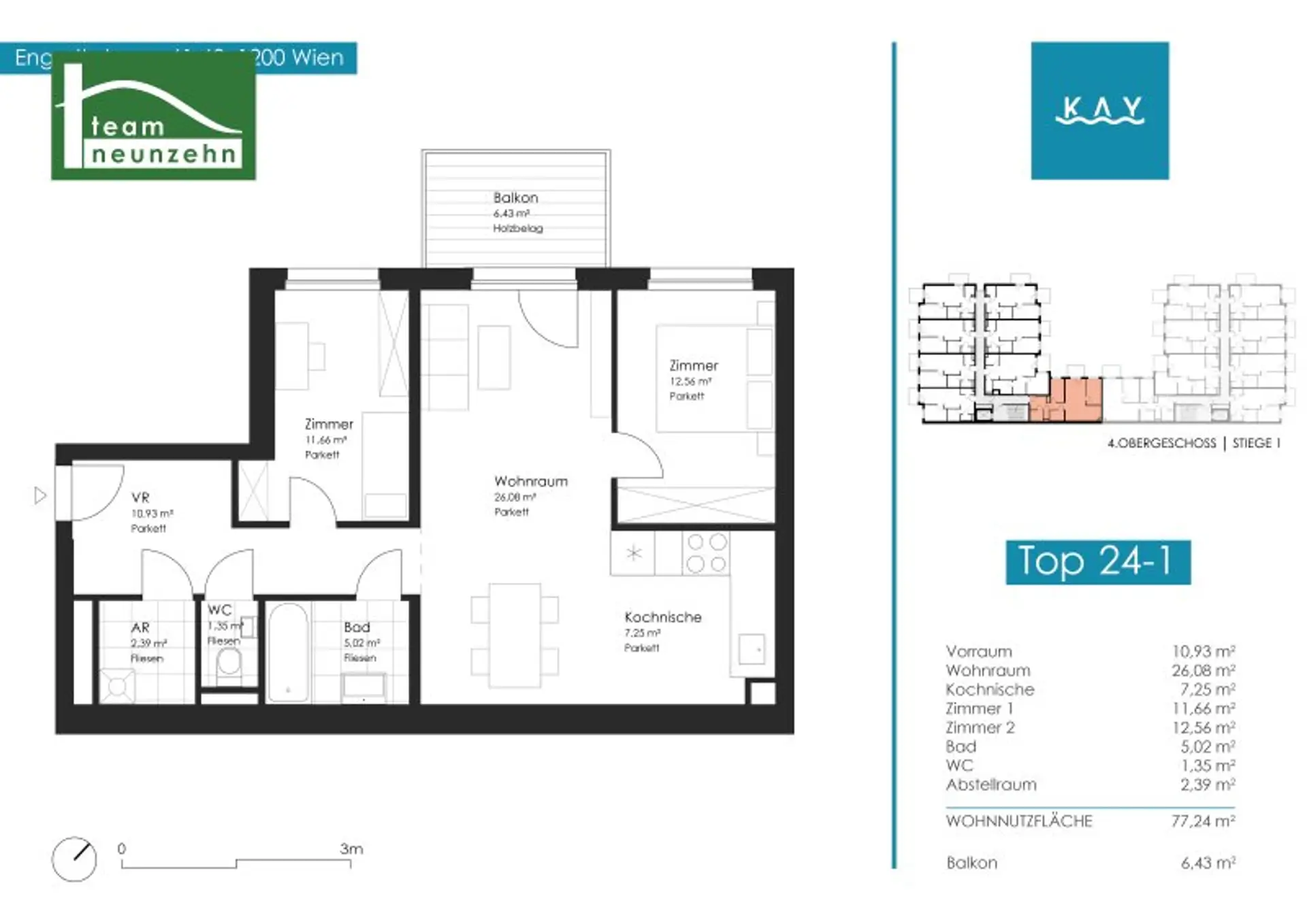 Diese 3-Zimmer-Wohnung mit ca. 77,24 m² Wohnfläche + ca. 6,43 m² Balkon liegt im 4. Obergeschoss und gliedert sich in folgende Raumaufteilung: