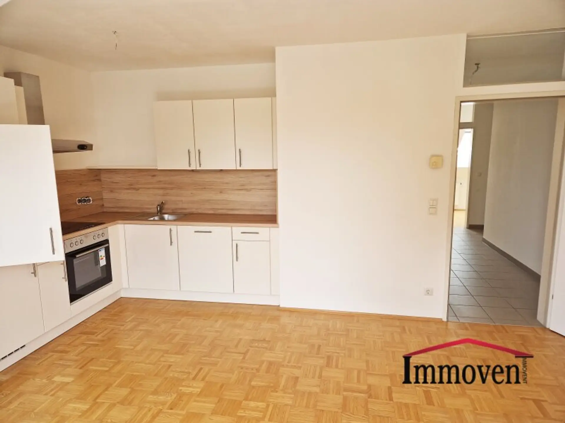 - Wohnraum mit integrierter Küche und Zugang auf den Balkon