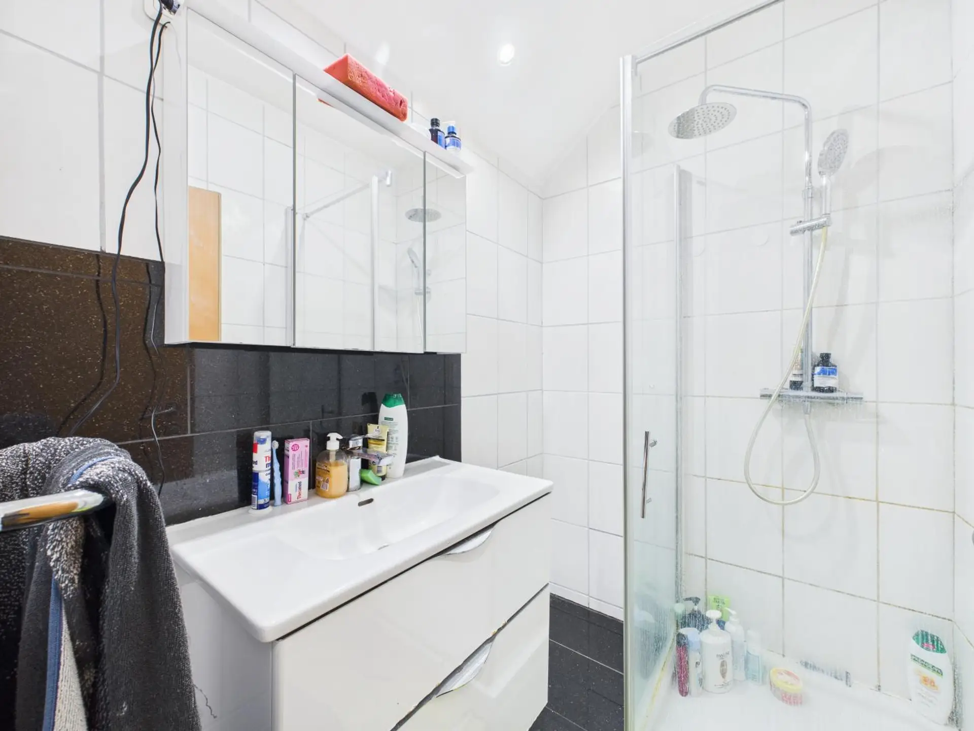 - modernes Badezimmer mit Dusche, großformatigen Fliesen und eleganten Badmöbeln